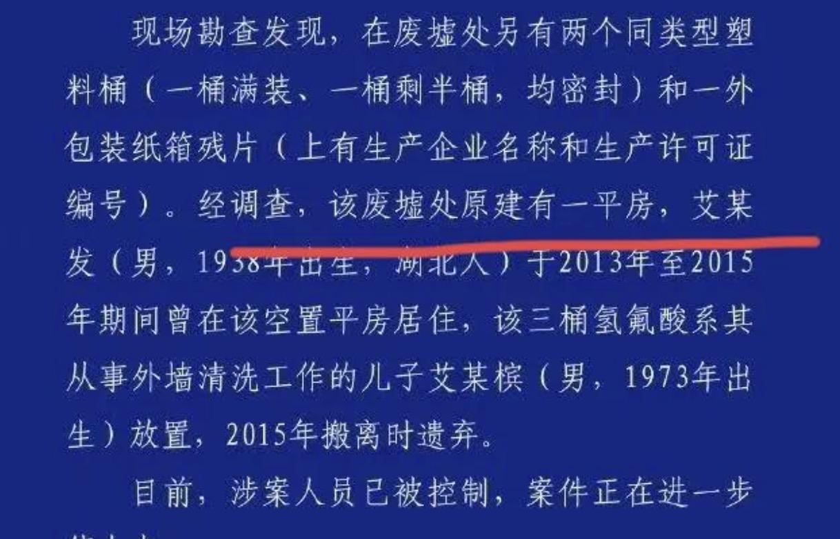 女子踩到化骨水不幸去世后续来了,帽子叔叔不仅又找到了2桶氢氟酸,而且还找到了这三桶氢氟酸的主人! 女子踩中氢氟酸的位置,原先并不是空地,而是有人居住的地方,后来遇到了拆迁,房子被扒了之后就成了空地。于是帽子叔叔顺藤摸瓜,就找到了曾在房子居住的男子艾某。又经过一番调查后发现,这三桶氢氟酸是艾某从事外墙清洗工作的儿子所有,后来在2015年搬走的时候就被遗弃了。目前他已经被帽子叔叔给控制,而去世女子家属则表示,将会追究相关人员的法律责任。 那随意丢弃氢氟酸的艾某,他将会面临什么样的处罚呢?该有的赔偿责任是必定少不了的,而且他随意丢弃氢氟酸已经致人死亡,他的行为已经构成了过失投放危险物质罪,可处3到7年的有期徒刑,与此同时他还有可能会面临5到10万的罚款。可同样的,事发地为长期闲置的拆迁区域,并没有采取围蔽措施,如今已沦为居民垦荒种菜场所,所以很明显当地街道办存在监管失职,也需要承担相应的责任。 谁触犯了法律,谁没有尽到职责,谁就应该为此负责,可这起悲剧的背后,还有一个重大的安全隐患,就是危险化学品流通监管的问题。按理说这类危险的化学物品,控制应该是相当严格的,可这个艾某却可以随意买到,而且还可以随意的使用,这是一个很大的漏洞。当然了这是十多年前,相关监管可能不到位。 可问题是这件事发生后,记者还能在电商平台上,看到氢氟酸溶液的售卖,而且销量还不低的样子。当然了在被曝光后,已经被平台给下架了,所以现在是搜不到了。可这些被当成普通清洗剂,被售卖出去的氢氟酸,都是一个个的安全隐患。不发生问题还好,一旦发生了问题,都有可能是悲剧!所以对危险化学物品的监管,任重而道远啊!