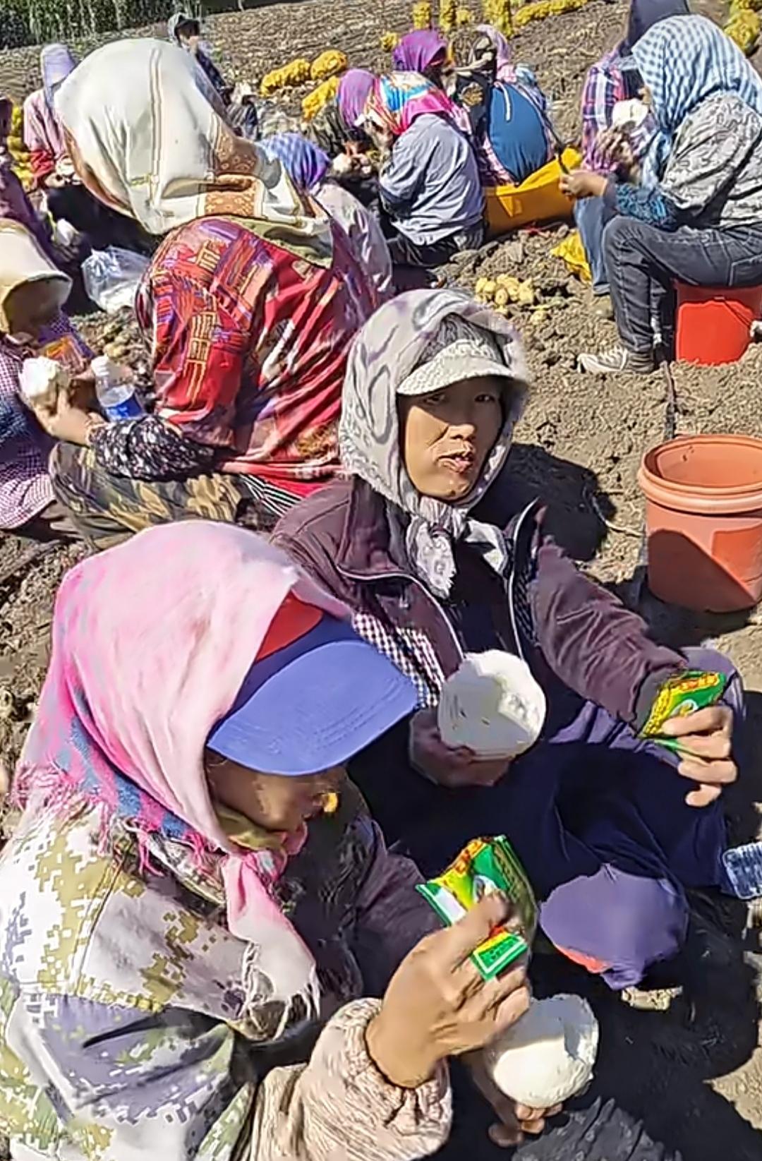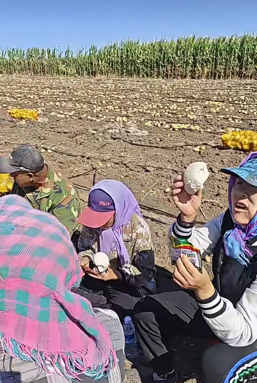 一口馒头,一口榨菜,一瓶水,这群大姐和零星几个大哥在土豆地里,把午饭吃得津津有味