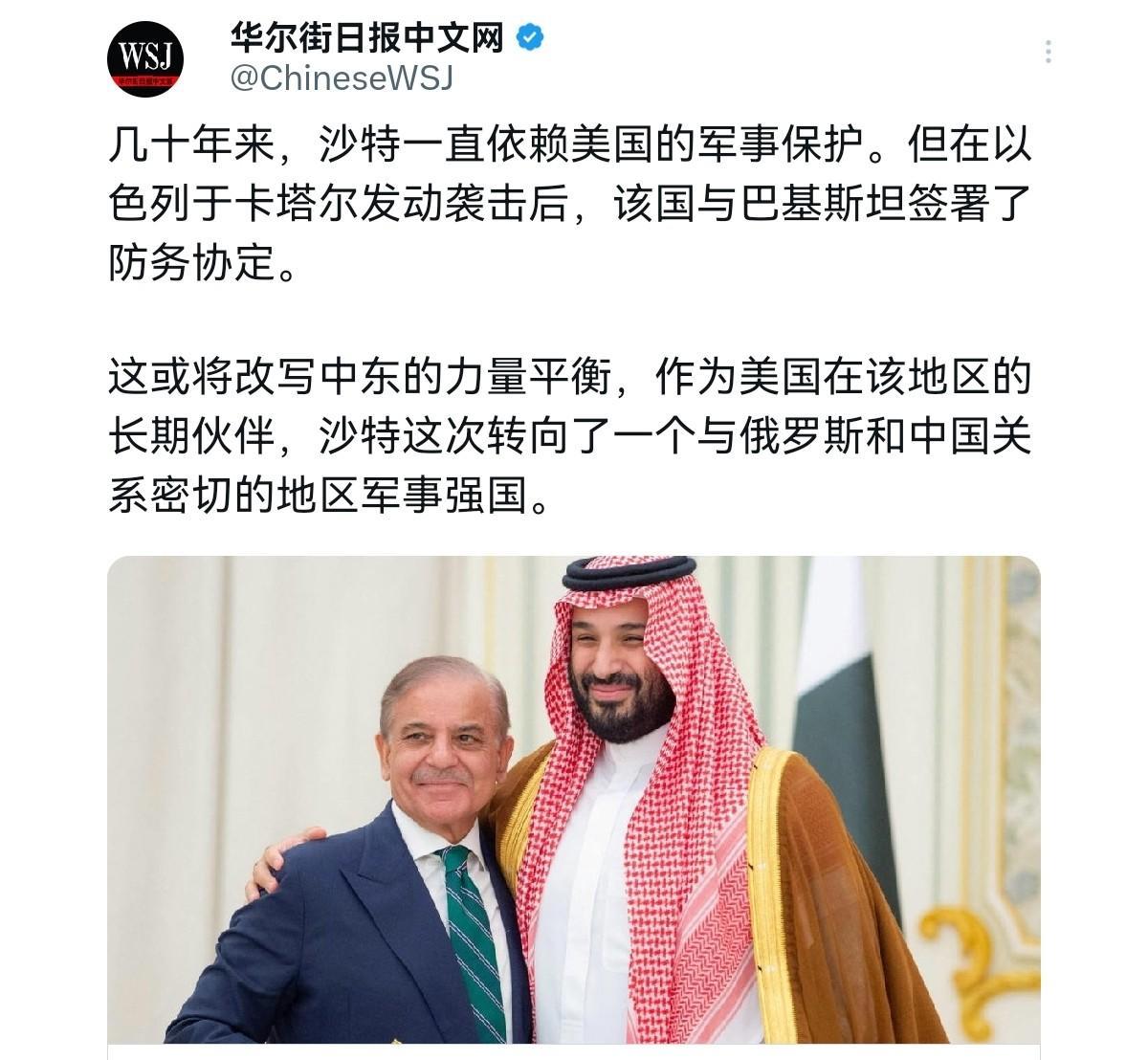 美国也感到大事不妙了!在巴基斯坦与沙特签署共同战略防御协议之后,美国华尔街日报也感到不同寻常。9月19日,美媒刊文称,沙特阿拉伯几十年来一直依赖美国的军事保护。现在,它正把目光投向别处。这或将改写中东的力量平衡,作为美国在该地区的长期伙伴,沙特这次转向了一个与俄罗斯和中国关系密切的地区军事强国,这是一个不安的信号。或许,中国将借助巴基斯坦进一步对中东施加影响力。 很显然,从美媒的报道来看,对于沙特与巴基斯坦的结盟,美国心里面是不舒服的。沙特这样的动作,这明显充满了对与美国关系的疑虑。当然,这不能怪沙特。卡塔尔也是美国在中东的重要盟友,但是以色列袭击卡塔尔,卡塔尔的防空系统形同虚设,而每年掏钱购买大量的美国军事装备,并没有给卡塔尔带来安全,这当然也让沙特感到紧张。 从沙特的角度而言,这样的抉择完全正确。鸡蛋是不能放在一个篮子里面的。对美国而言,这确实是刺激有点大。其一是,沙特的转向,这直接将削弱美国在中东的影响力。最起码沙特不会那么依靠美国。其二是,美国在中东军事主导的地位,也会受到影响。以色列仗着美国的支持为所欲为,但有核武器的巴基斯坦跟沙特站在一起,这对于以色列无疑是震慑。 其三是,美国在中东的部署也可能受到影响。既然沙特可以与巴基斯坦结盟,弄不好其他国家也会效仿,说不定那天就会有中东国家站出来寻求与非美国家的军事合作。很显然,美国现在预感是越来越不好。但这样的变局完全是美国咎由自取,谁让美国一再的放纵以色列呢?