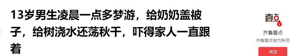 “彻底解释不清了”!江苏,13岁男生凌晨一点多突然从床上起来,穿上鞋子就往外走,家人急着问他你干啥去,他也不吭气,直挺挺往前走,一会给路边的树浇水,一会又跑去荡秋千,担心出事的家人,只能跟在他身后提心吊胆,熬了一整夜没敢睡!网友全看懵了,他是怎么做到的? 孩子半夜里的一些奇怪举动,足以让父母的心提到嗓子眼。但恐慌解决不了问题,科学知识可以。 比如,儿童夜间的“睡行”现象,其实比我们想的要普遍。有数据显示,大约15%的儿童都有过类似经历,大部分长大了也就好了。 普遍,不等于可以忽视。如果孩子发作得太频繁,比如一周超过两次,或者行为越来越复杂,那就别犹豫,马上去医院。通过脑电图之类的检查,先把癫痫这类藏得更深的健康问题排除了,才能真正安心。 社交媒体上,我们常能刷到孩子梦游的“可爱”视频,评论区一片“哈哈哈”。但对于亲历的家庭来说,那一刻没有半点轻松,只有实实在在的恐惧。 在追究原因之前,父母最先要做的,是堵住安全漏洞。因为不管孩子是无意识还是半清醒,深夜独自一人,危险分毫不减。 最重要的就是预防,把防护措施做到前面。门窗一定要锁好,走廊过道清空杂物和危险品。家里有条件的,装个监控或者门窗警报器,至少能保证孩子是在一个绝对安全的空间里活动,万一出门也能第一时间知道。 就在今年八月,这份恐惧就让江苏淮安的赵女士结结实实地体验了一回。凌晨两点,她一觉醒来,发现5岁半的女儿不见了。 监控录像让人心惊,一点多,孩子就自己开了卧室门和大门,走了出去。家人和物业在小区里几乎是跑着找人,最后在人造湖边,看到了那个光着脚的小小身影。她没在哭闹,只是安安静-静地看着湖里的黑天鹅。 和典型的梦游不一样,女孩被找到时是清醒的,能回答妈妈的话,还说自己出门是“为了找妈妈”。这个细节,让整件事变得更加复杂。 医生也判断,这可能不只是单纯的睡行症,里面或许还夹杂着焦虑之类的其他情绪。这种半梦半醒、目的不明的状态,让家长事后想起来更加害怕。 当然,也有完全是另一种情况的。9月17日凌晨,江苏徐州的徐先生一家,同样被13岁的儿子惊醒。 他们屏住呼吸,看着儿子先是走进奶奶房间,轻手轻脚地掖好被子,然后提起水壶,去院子里给树浇水。 最后,还在秋千上坐着晃了快二十分钟。家人全程没敢出声,只是在后面悄悄跟着。第二天问他,男孩什么都不记得,看了监控也只觉得好笑。 这就是典型的睡行症。简单说,就是孩子大脑里负责思考和记忆的部分还在睡觉,但管着身体运动的区域却醒了。 所以他能睁着眼走路,能避开东西,甚至能做些平时做惯了的复杂动作,比如浇水、盖被子。这些都是身体的“肌肉记忆”在主导。第二天大脑醒来,自然对头天晚上的事一片空白。 发生在江苏的这两件事,情况不同,却都指向了同一个让所有父母焦虑的问题:孩子半夜自己跑出门,到底该怎么办? 答案其实已经很清楚了。冷静应对,及时求助,这才是保护孩子最有效的方法。 信息来源:《13岁男生凌晨一点多梦游,给奶奶盖被子,给树浇水还荡秋千,吓得家人一直跟着》,齐鲁壹点,2025年9月18日。
