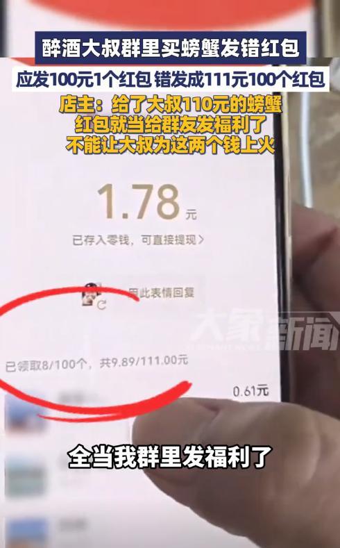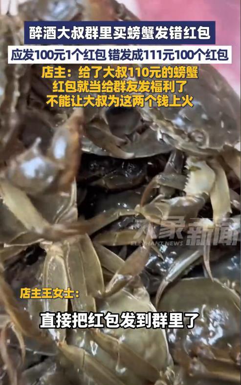 这老板有格局!9月17日,山东威海,一男子酒后找水产店老板买螃蟹,本应给老板发一个100元的红包,结果却在群里发了个111元的红包,还分成一百份被群友领走了!老板弄清事情经过后,还是给了男子螃蟹,红包则当做给群友的福利了。网友:这老板会做生意! 如今,正是大闸蟹上市的季节,再加上双节的临近,不少水产市场挤满了买螃蟹的客人,不过,在付钱时可一定要看仔细了,可别把密码当成金额付给了人家。 这天,突然有客户联系王女士,要买100块钱的螃蟹,可过了一会后,男子却在群里发了个红包,很多群友没有搞清怎么回事,就把钱给领了。 王女士也有些纳闷,就询问了对方,男子这才反应过来,自己因为喝酒的缘故,把钱发错了! 随后男子焦急的来到店里,给王女士解释了一下。 王女士倒也大方,并没有让男子再付给自己100元,而是直接装好了螃蟹给他,这钱就当做是给群友的福利了。 这么算下来,男子虽然亏了11块钱,但好歹买到了螃蟹,倒是老板娘“亏了”。 其实吧,老板娘亏没亏还真不好说,她的这一举动让群友看到了她的实在,相信之后会有更多的人来找她买螃蟹。 大家对于这件事是怎么看? 信息来源:《9月17日(采访)山东威海,醉酒大叔群里买螃蟹发错红包,应发100元1个红包错发成111元100个红包,店主:给了大叔110元的螃蟹,红包就当给群友发福利了,不能让大叔为这两个钱上火》大象新闻