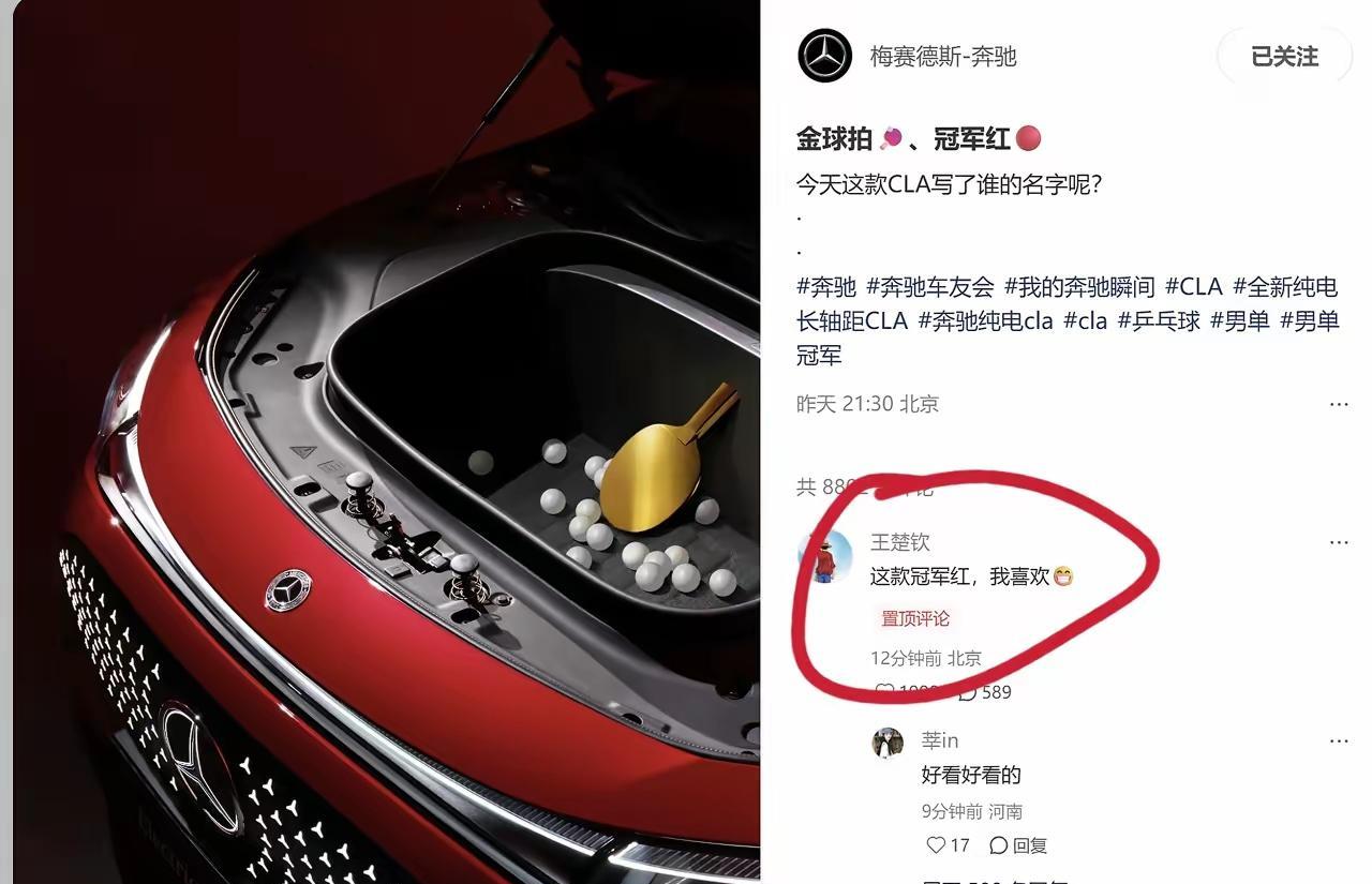 奔驰这是把若隐若现玩的透透的,王楚钦的球迷说一下那个影子是谁? 这是终于谈成了呀,王楚钦开着红色的奔驰招摇了很久了,还有奔驰与王楚钦的多次互动,以至于粉丝看到红色奔驰都想起了王楚钦。