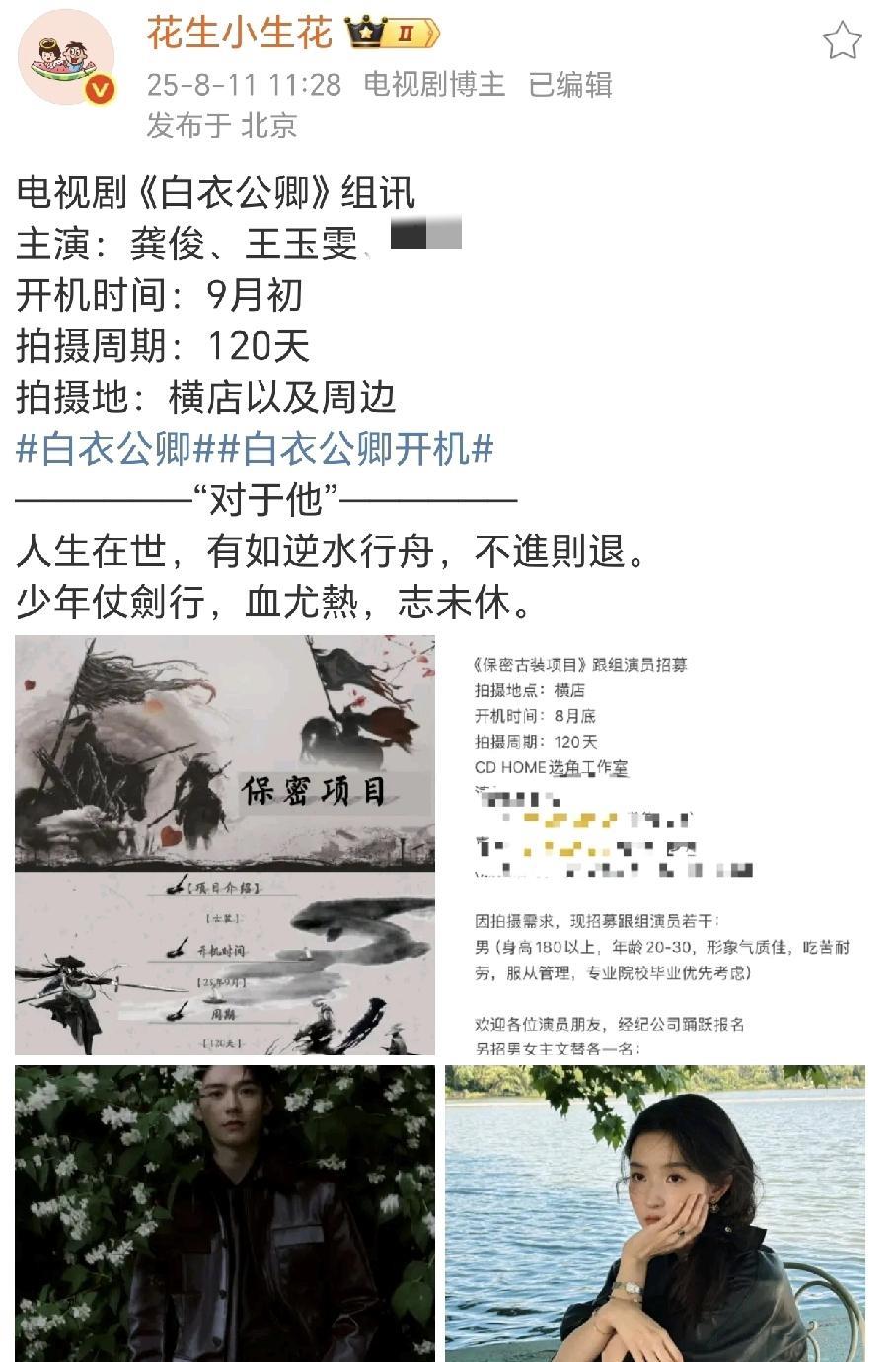 龚俊进组啦!! 先说一句恭喜,刚刚录完《花少7》,现在无缝进组《白衣公卿》,事业
