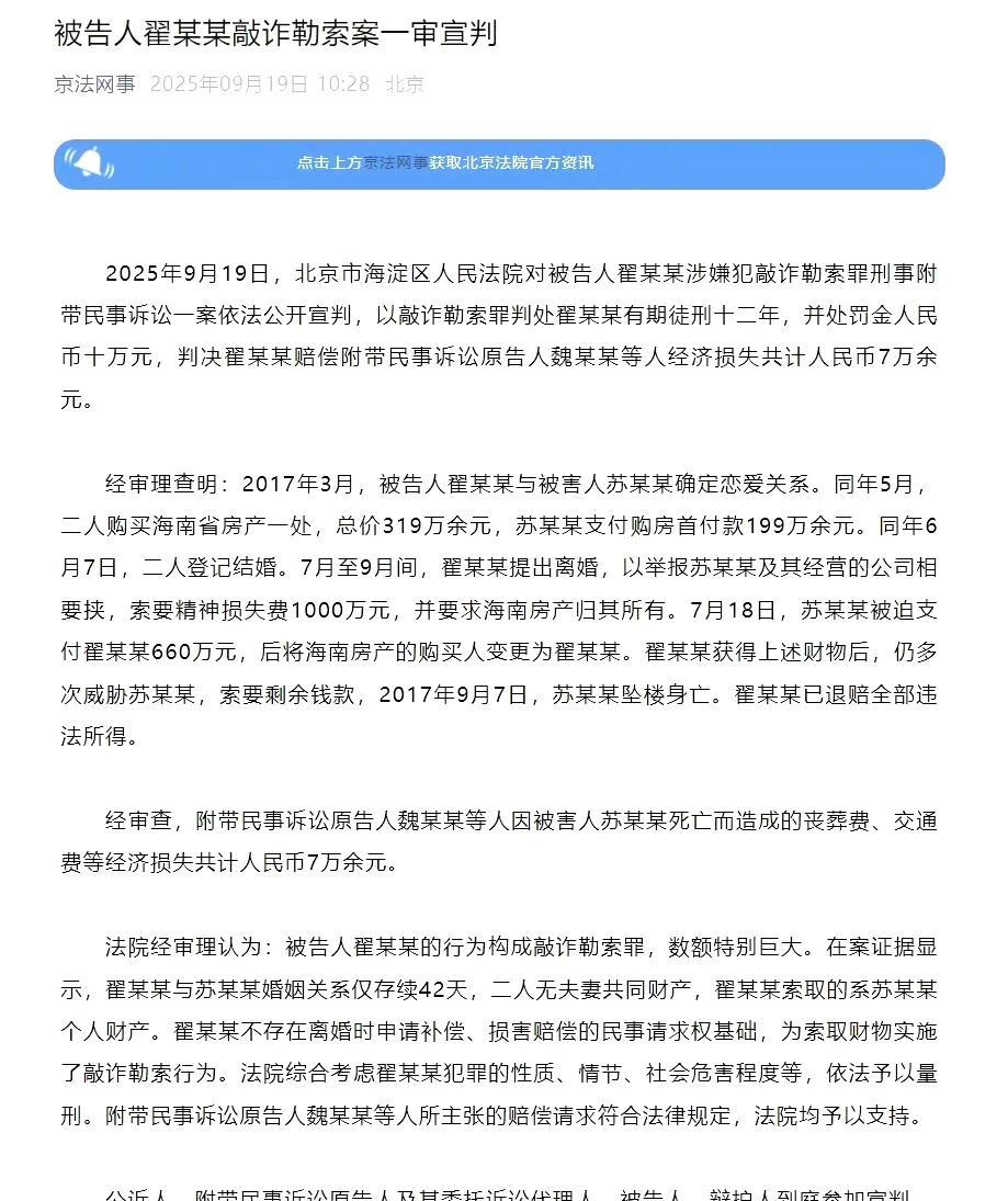 大快人心,翟欣欣被判12年! 翟欣欣与被害人苏某确定关系后,以举报苏某公司为由先后向苏某索取1000多万,并在获得财产后继续要挟丈,最终导致苏某不堪重负,选择坠楼。 翟欣欣此前通过各种手段先后从四任丈夫那里获取多套豪宅别墅、多辆豪车,以及数千万现金,如果不是第四任苏某因为轻生引起舆论关注,那么她还将继续寻找下一个猎物。 她“成就”如此之高,“收获”如此之大,绝不是靠自己一个人就能完成的,你觉得呢?