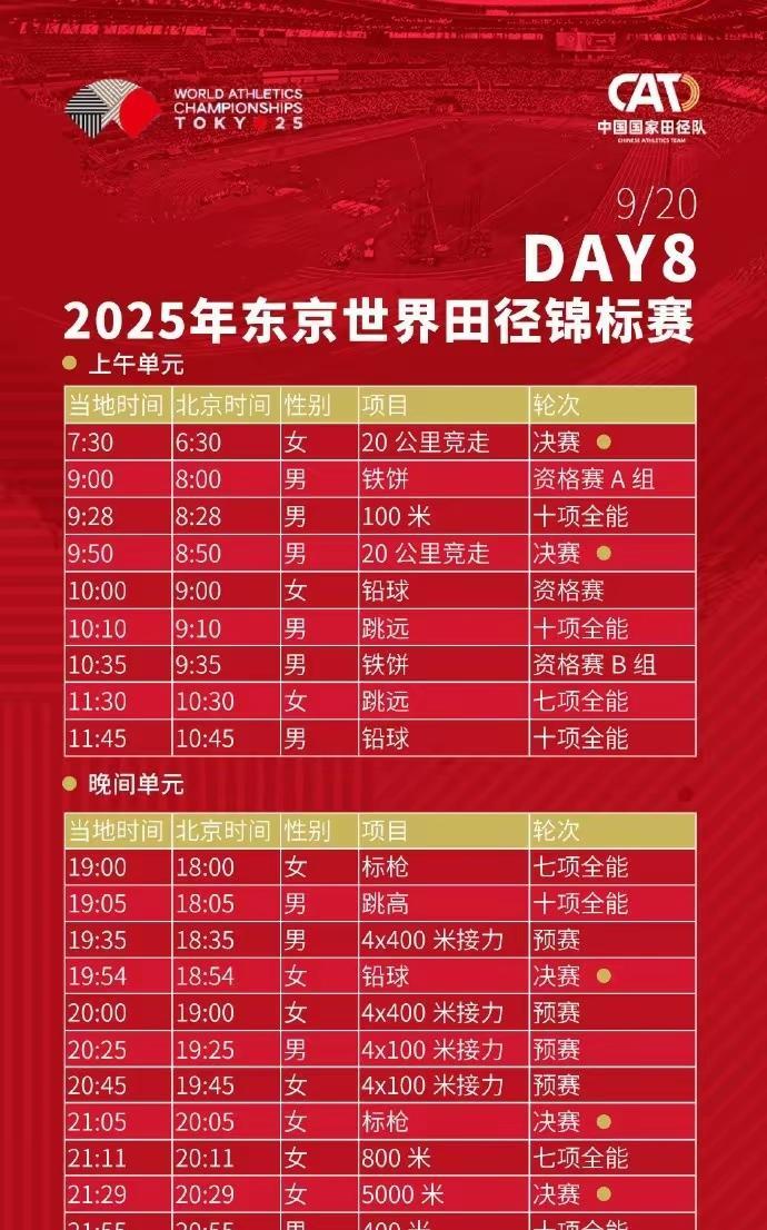 田径东京世锦赛还剩下三天,看看三天赛程表,中国夺金点盘点,最大可能的夺金点,女子20公里竞走,女子竞走我们有世界冠军杨家玉,马丽,彭丽,吴全明四人参赛 第二夺金点是老将巩立姣,张林如,孙悦参赛的女子铅球 第三男子20公里竞走,王朝朝,钱海峰,李陈杰 其余基本没啥竞争力,女子标枪戴倩倩冲击奖牌吧 希望三个夺金点能兑现一金[祈祷][祈祷][祈祷][祈祷][祈祷][祈祷][祈祷][祈祷][祈祷][祈祷][祈祷][祈祷][祈祷]#东京田径世锦赛#