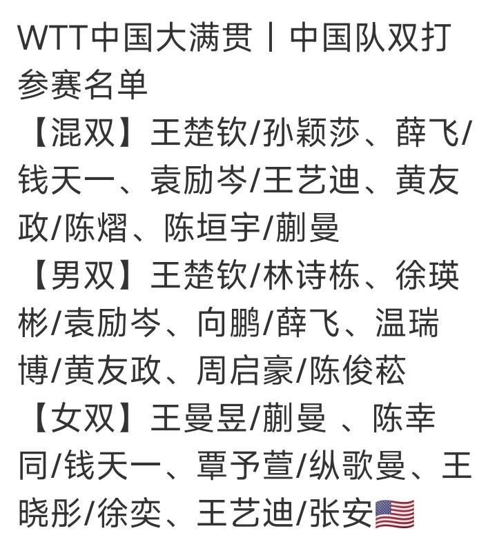 主办方外卡发下来了[笑哭]! 获得WTT中国大满贯主办方外卡的选手名单发布了,国乒不少选手获此优惠,名单如图。 另有各五对儿组合参加双打比赛。只遗憾栋曼组合没参赛,蒯曼身兼三项,却和陈垣宇搭档了混双,林诗栋却只有男单、男双两项。