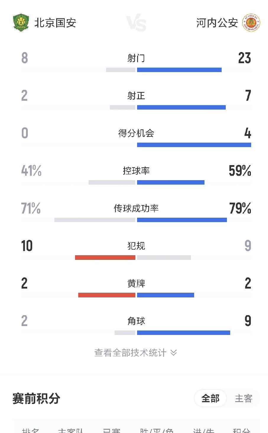 射门次数23:8,得分机会4:0,控球率59%:42%,北京国安各项数据被越南球