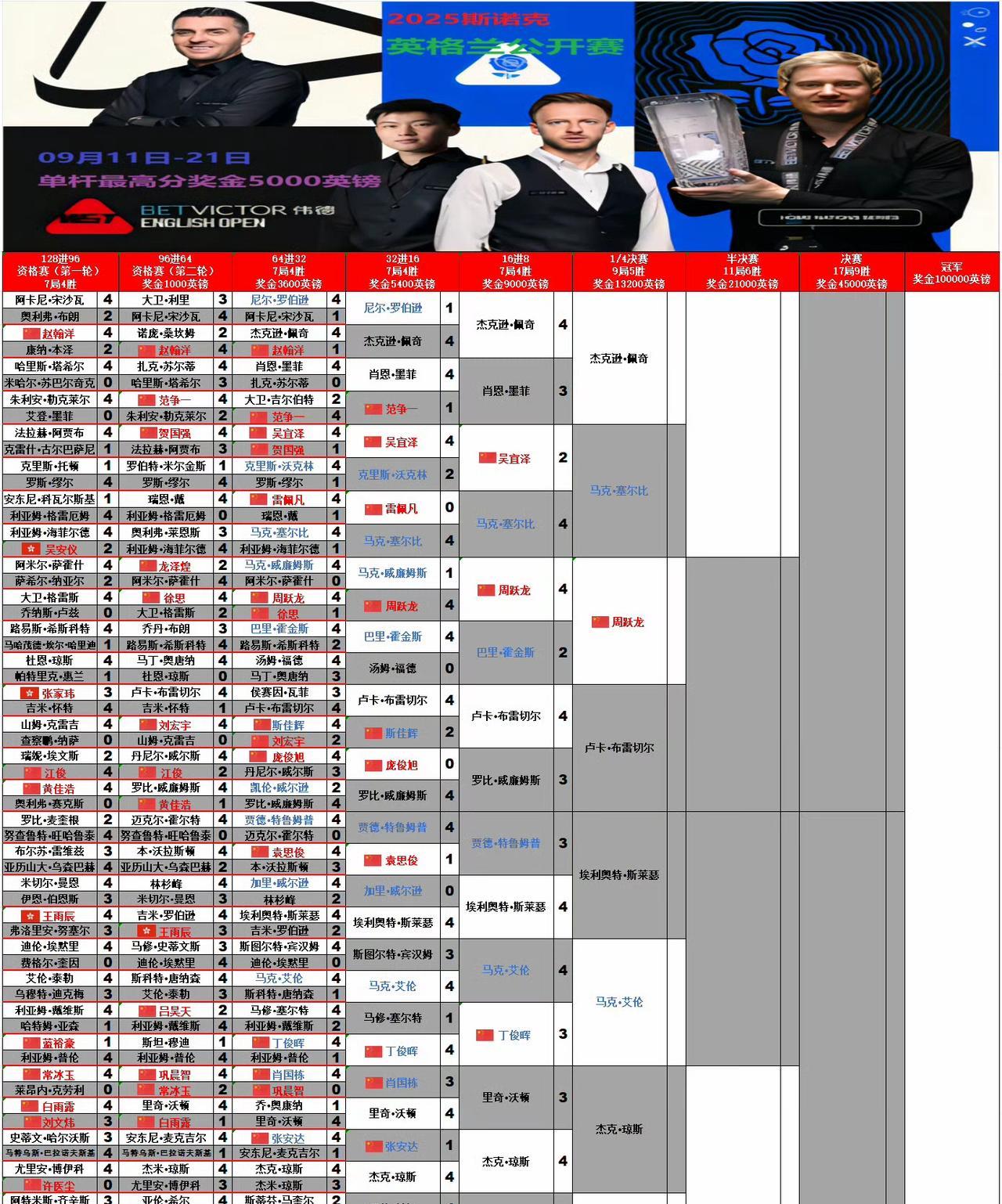 谁也没想到小光头居然一路打进八强!击败丁俊晖的艾伦等着被虐吧。英格兰公开赛八强出炉,大牌只剩塞尔比了。 周跃龙—布雷切尔 佩奇—塞尔比 斯莱塞—艾伦 杰克琼斯—亚伦希尔 四强名单预测:周跃龙、塞尔比、斯莱塞、杰克琼斯。