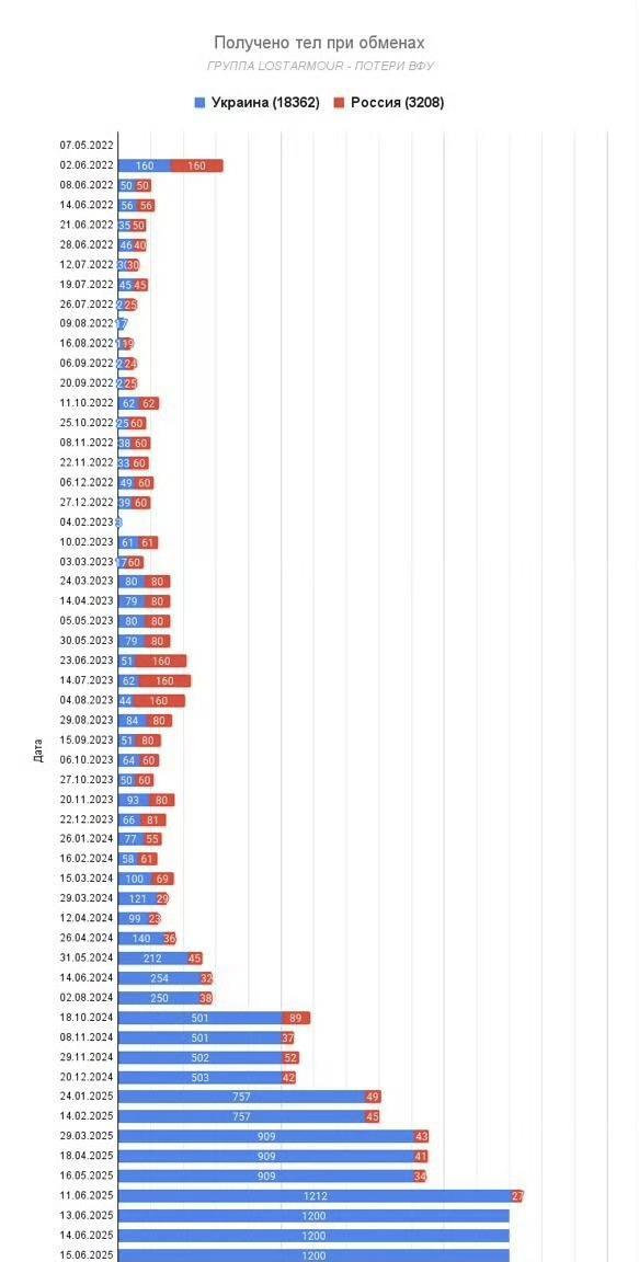 俄乌冲突以来,双方交换阵亡士兵遗体数量的统计量化图。因为双方换俘都是公开的,所以