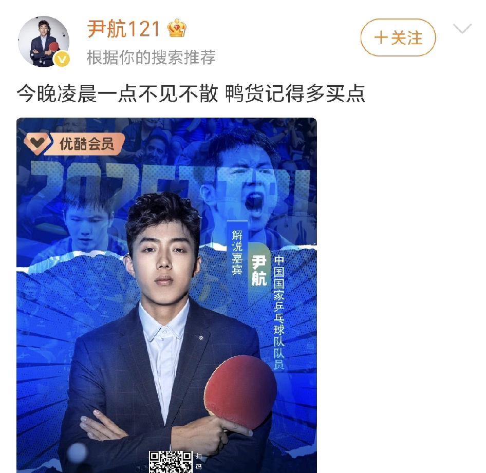 好家伙,怎么个意思? 都知道尹航是樊振东铁粉, 也都知道尹航要解说樊振东德国杯首赛, 尹航也知道一定会有很大的流量! 这个鸭货让人看不懂了! 尹航发文:凌晨一点不见不散,鸭货记得多买点! 一时搞不懂是他平时直播卖鸭货要做宣传还是让大家自己多买点鸭货以防看樊振东的比赛看的太晚补充补充能量! 大家觉得是怎么个意思?