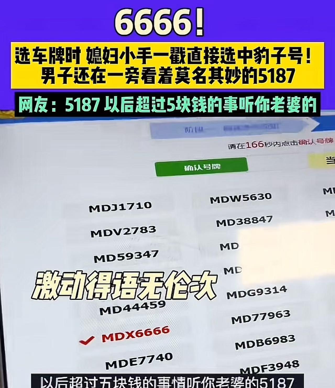 “这运气不服不行!”江苏,丈夫买新车让妻子摇号,妻子竟然摇到“6666”这种极品豹子号,可丈夫第一眼没看到,想要选5187!妻子连忙点中6666,丈夫这才反应过来!网友:5187?我看你是“虎了吧唧”!在6666面前你说5187,就好比医院里问保大保小!!! (来源:后浪视频) 丈夫带着妻子去选车牌号。一开始,他们先在手机上尝试自选,可没有一个满意的,不是觉得数字组合生硬,就是感觉寓意不够好。无奈之下,他们只好把希望寄托在机选上。 丈夫觉得自己运气不好,让妻子来点屏幕。妻子怀着既紧张又期待的心情,小心翼翼地点击了确定。 屏幕开始快速滚动,一个个号码如走马灯般闪过。当屏幕终于停下,多个号码呈现在眼前时,妻子第一眼就看到了那个令人心跳加速的“MDX6666”! 她简直不敢相信自己的眼睛,激动得捂着嘴巴,一时竟说不出话来,只感觉心脏在胸腔里“砰砰砰”地狂跳。 而此时的丈夫,注意力还没集中在“6666”上,他第一眼就相中了“5187”,觉得这个号码谐音是“我要发妻”,寓意着自己能和妻子一起发家致富,便转头跟妻子说:“要不咱就选5187……” 可是妻子却发出一声惊喜的尖叫:“哎呀,妈妈呀,豹子号,6666啊……” 说完,她眼疾手快,飞快地选中了“MDX 6666”,生怕丈夫一个脑子抽风,真的点了“5187”。 丈夫看到“6666”后,瞬间激动得像个孩子,嘴巴里不停地念叨着:“哇哇哇,可以可以可以……”那模样,仿佛中了什么超级大奖。 此事引发了热议。有网友打趣道:“嫂子,不是我挑事,赶紧查查他前女友,我挺怀疑这‘5187’是前女友的手机号或者QQ号之类的,居然在四个6面前都视而不见,这也太离谱了吧!” 还有网友一本正经地说:“以后家里事都听你老婆的,听到没,编号5187,可别再犯糊涂啦!” 也有网友提出了不同的担忧:“挂太好的车牌,要是自己车不够高级,得到的可不是羡慕,而是妒忌。妒忌这东西是很害人的,有时你可能会莫名其妙被人刮痕,出门也会被多查行驶证,还是选5187低调点好!” 在我看来,这事儿还有别样的温暖。丈夫第一眼想要的是“5187”(我要发妻),这简简单单的几个数字,却饱含着他对妻子深深的爱意。 正所谓“亏妻者百财不入,爱妻者风生水起”,丈夫的这份心意,就是最好的证明。 而且,摇号这么重要的事情,他放心地交给妻子,也正是这份信任,让妻子给他带来了如此难得的幸运。 虽然“6666”无比珍贵,但丈夫对妻子的爱意——“5187”,又何尝不是一种无价的财富呢?