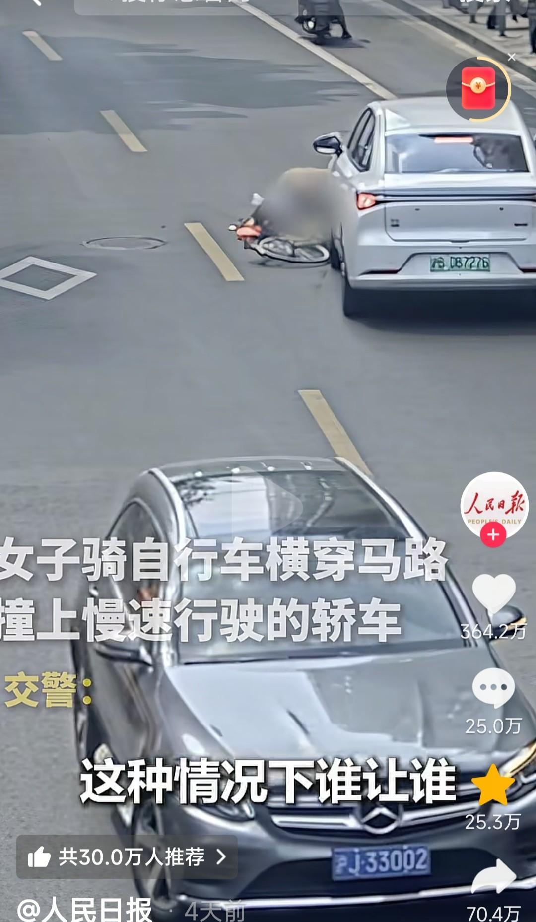 “交警执法火上人民日报了!”女子骑车横穿马路撞上慢速行驶的轿车负事故全责,家属称