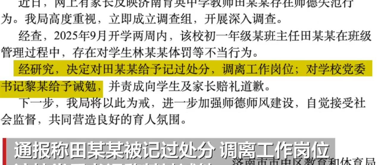 近日,山东省济南育英中学初一新生林某的母亲付女士接到了班主任田某的电话,老师上来就是一通输出:孩子学习成绩不行,不拔尖,这也不行,那也不行,把林某说的一无是处。 付女士听了心里不舒服,想想刚开学,就忍着了。 没想到,孩子上学俩礼拜,回家的时候眼睛发红,看着精神状态也很萎靡,怀疑孩子在学校被欺负了。 跟学校沟通后,付女士被允许观看了三天的班级监控,其中一段:午休时间,林某安静的坐在座位上,田老师走过去将林某的名字牌扔在当地,让其捡起来。这样扔了捡、捡了扔重复几次后,田老师依旧不解气,上去就扇了林某六七个耳光。 扇耳光、罚站、恶意刁难孩子,看到这些付女士当即崩溃了。学校查完监控后,承诺会处理此事。 9月18日,济南市市中区教育和体育局发布通告:确认初一年级班主任田某存在体罚行为,给予其处分,并调离工作岗位。学校党委书记给予诫勉,并责成向家长和学生道歉。 通告一出,付女士十分不满,认为对学校、对田老师的处罚过轻。她已经报警,并将起诉涉事老师,通过法律手段维护孩子的尊严。 刚开学两周多,老师就能拿成绩给一个孩子定性。这是工作生活中积累了多大的怨念,通过体罚学生宣泄情绪。 一个处分,调离工作岗位,没准正合她的心意。这不应该直接撤销教师资格,清除教师队伍吗!