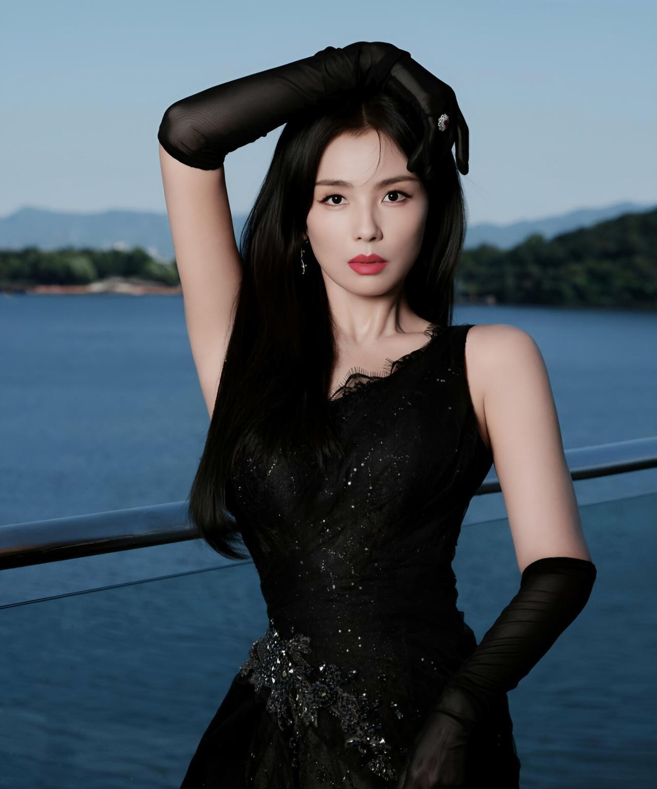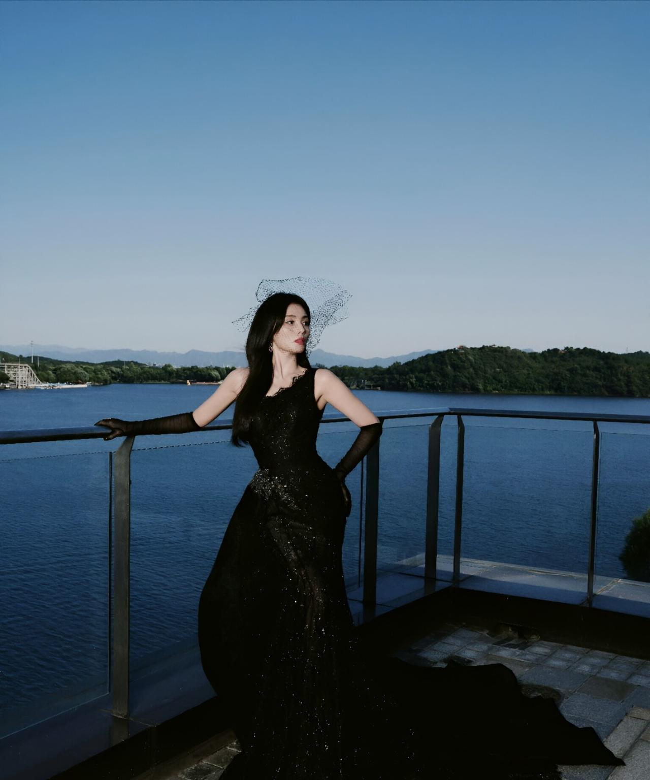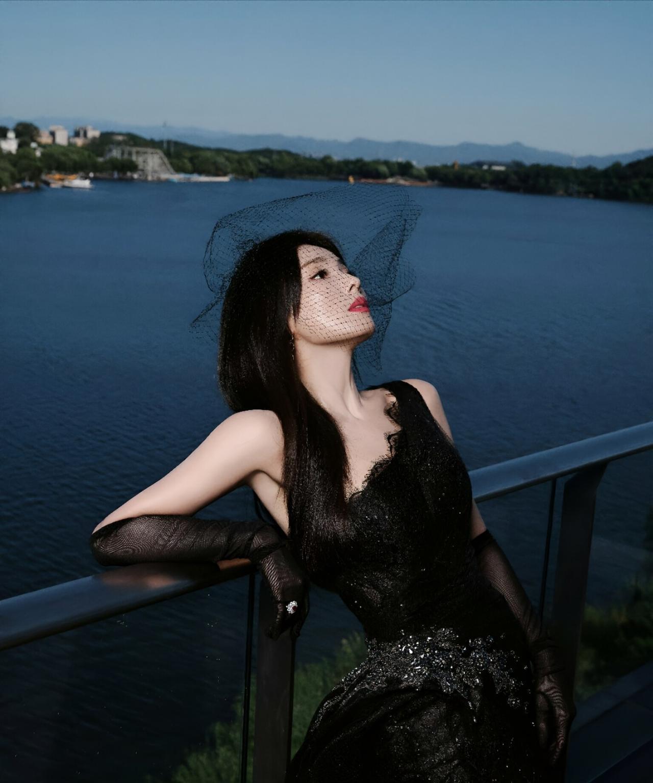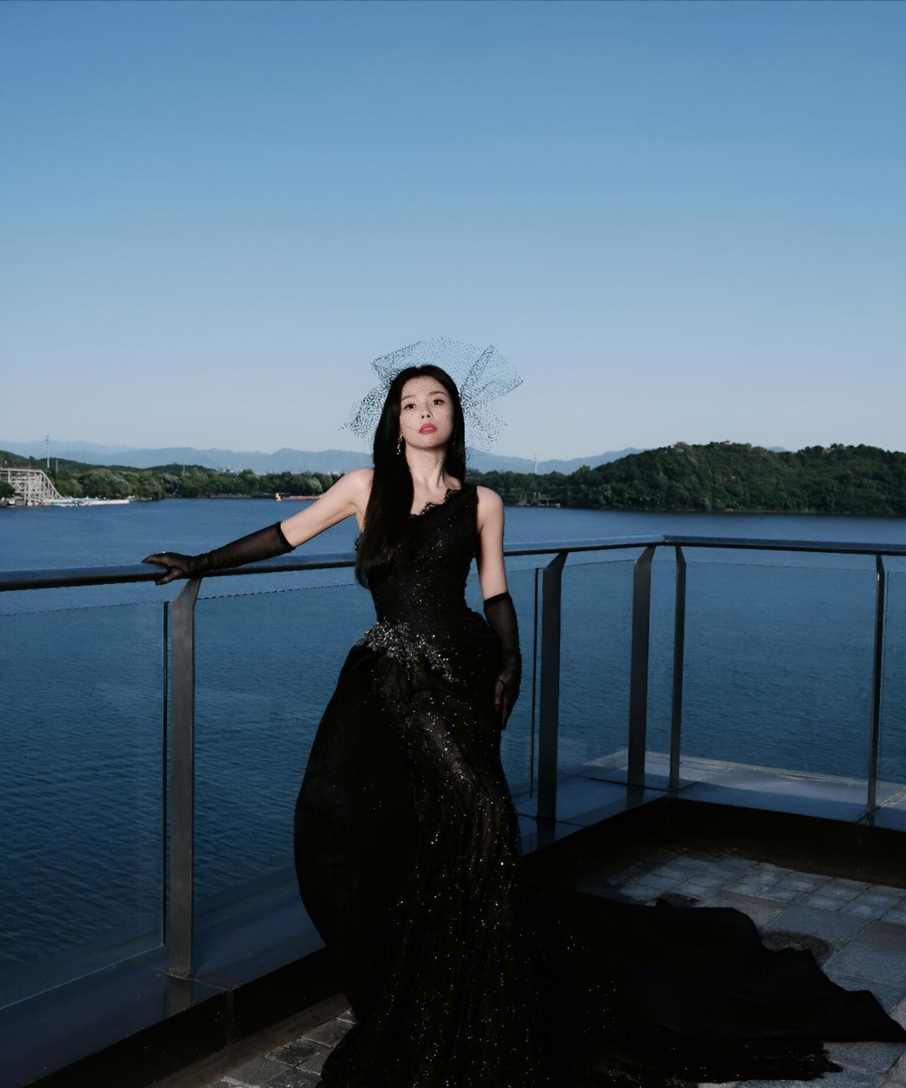刘涛星光礼服造型释出,湖光山色间演绎复古名伶的优雅 刘涛一袭黑色星光礼服,搭配网
