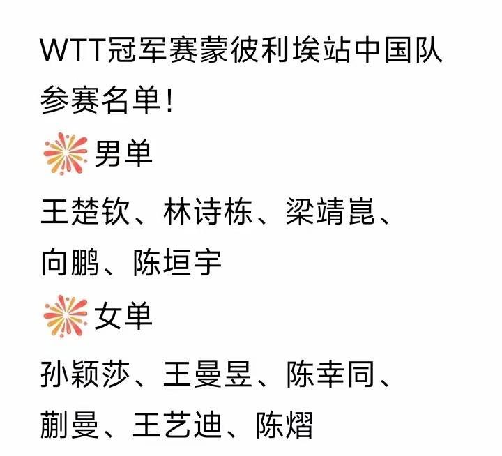 北京大满贯还没打呢? 蒙特利埃名单又出来了, 孙颖莎和王楚钦都是奥运金牌, 用的p卡, 没占用名额, 剩下四人参赛。 看来黄有政已经彻底被王皓放弃了, 宁愿用陈垣宇都不用黄有政了! 女队陈熠已经坐牢固主力位置。 她今年看来彻底打出来了!