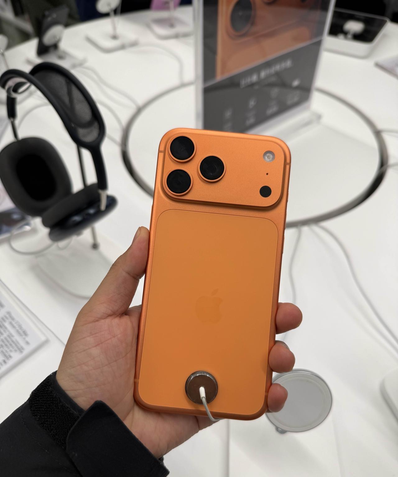 线下实际摸了一下iPhone 17 Pro真机,这代得益于一体化铝合金机身+类似MacBook Pro圆润的边缘倒角设计,拿在手里手感非常好,很润的感觉! 三个颜色,个人觉得银色是最漂亮的,蓝色镜头凸起部分很容易沾指纹、显脏,橙色太活脱了,不太适合我这种比较低调的人[吐舌] 但橙色好像还蛮讨女生喜欢的,排队看机的时候前面一个女生拿着橙色17 Pro Max看了得快10分钟,爱不释手,最后和她对象说“就要橙色了!”[马思纯的微笑]