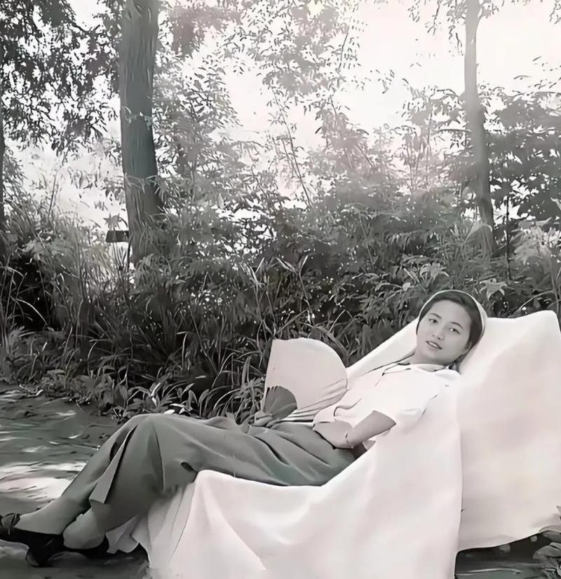 这是1956年,陈毅夫人张茜手拿扇子,斜躺在树下椅子上休憩的老照片。 张茜那张照