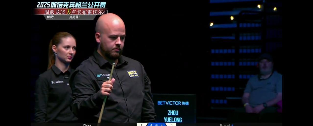 周跃龙赢得太惊险了。斯诺克英格兰公开赛我国选手周跃龙与布雷切尔的1/4决赛刚刚结