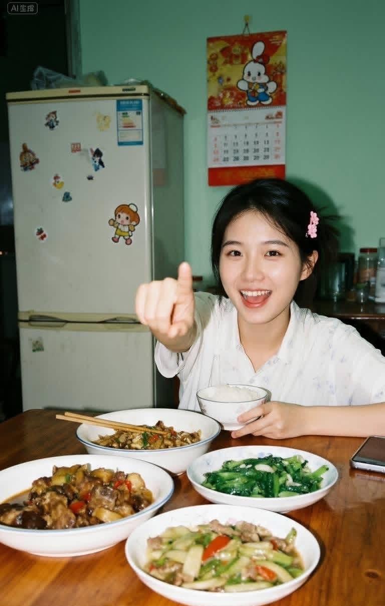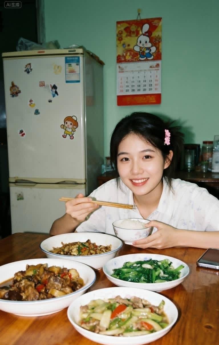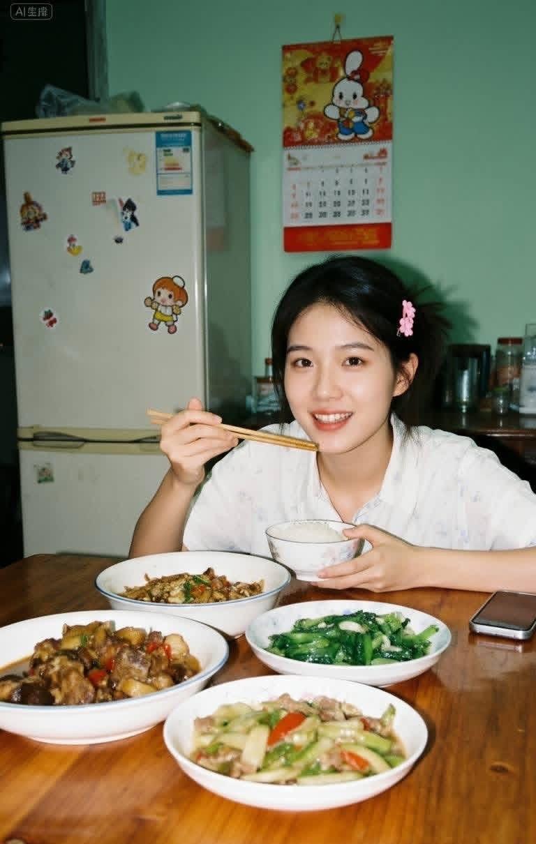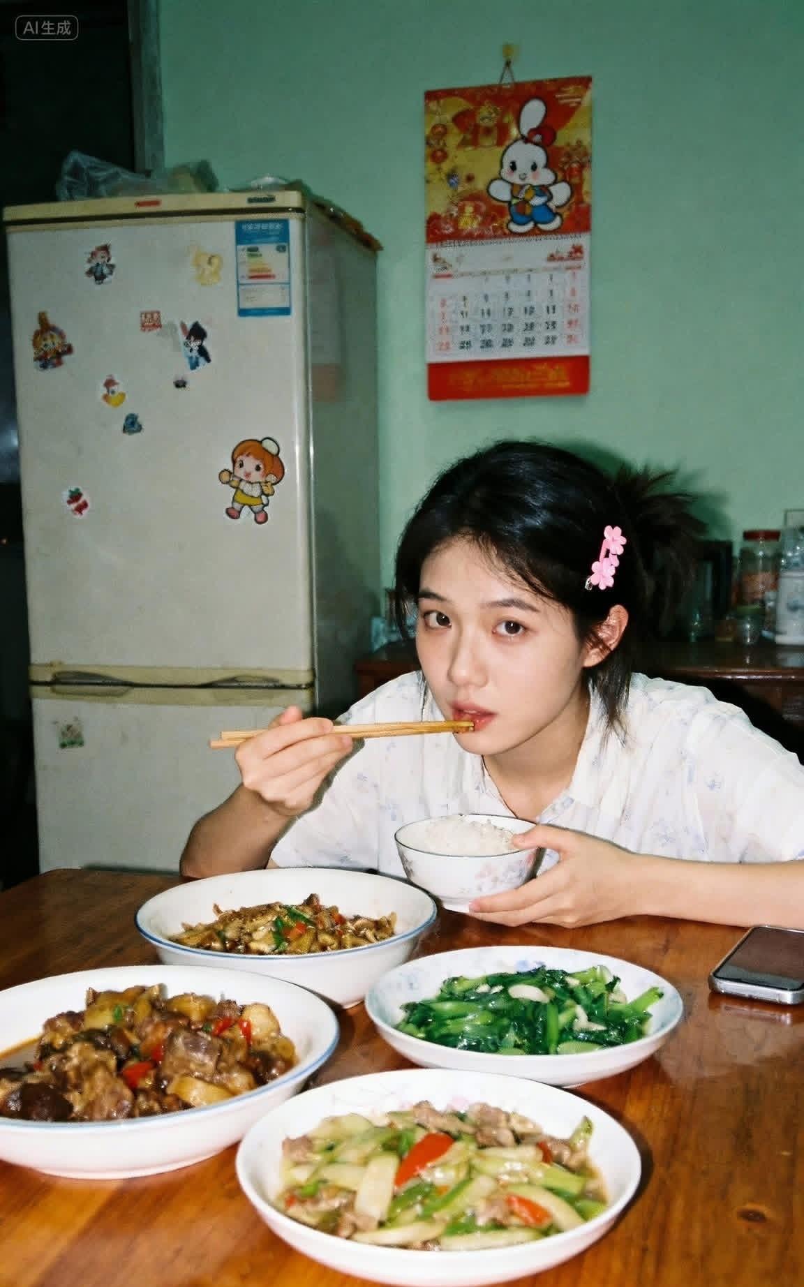 家庭餐厅里,2015年的装修风格,简洁的石灰墙,挂着年历,带有卡通贴纸的旧冰箱,木制的桌子摆着几个家常菜,桌子对面,一个女友在吃饭,慵懒的发型,樱花色的发夹,略显疲惫的神态,眼神温柔,轻微的黑眼圈,彷佛在思考。手机随意的打卡式拍摄,无任何拍摄技巧,导致暗处略微的曝光不足,路灯出现轻微眩光,画面带有些许杂点,镜头有不易察觉的灰尘。近距离拍摄人物。
