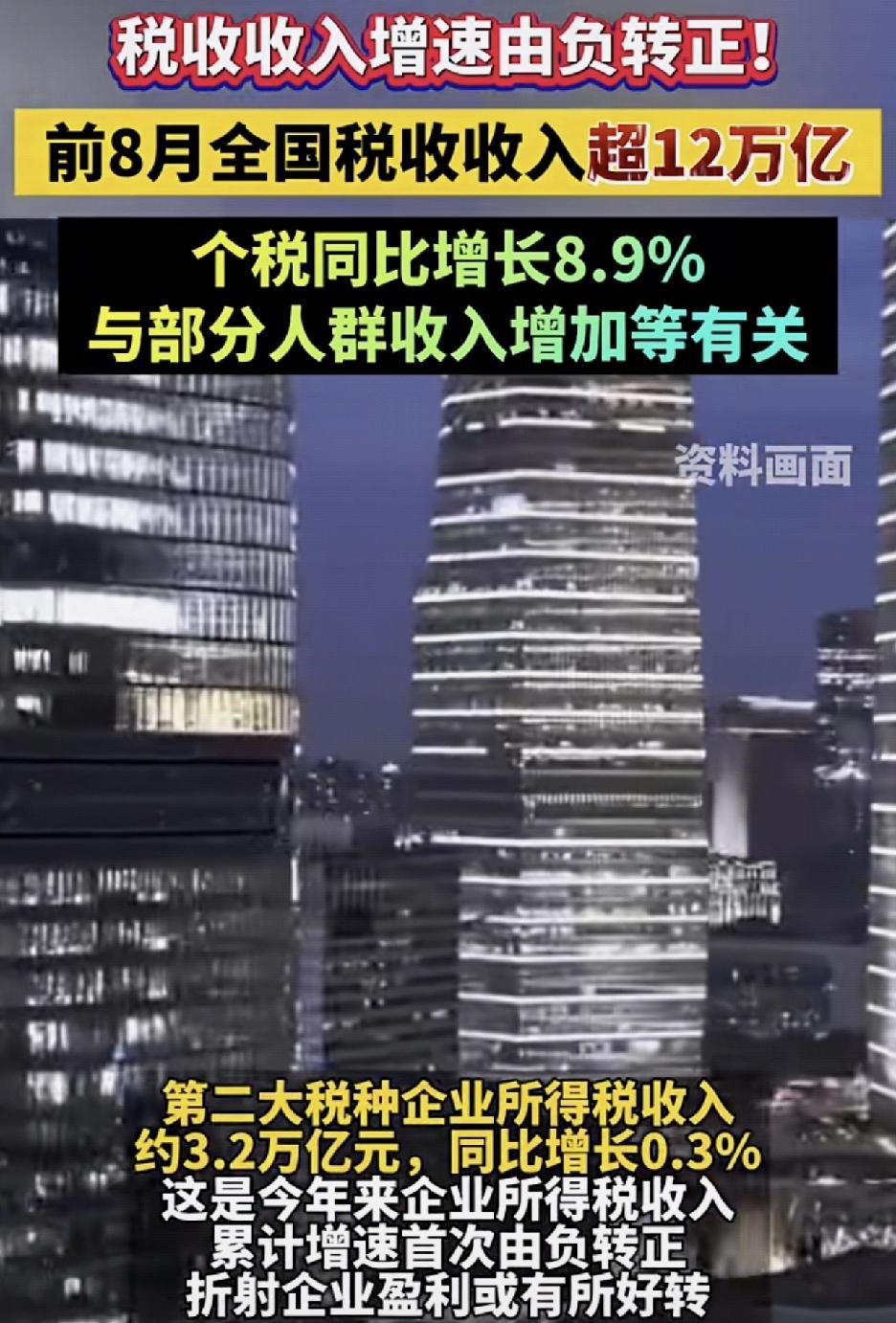 税收增速由负转正,经济回暖 近日,财政部公布的2025年前8个月财政收支情况引发广泛关注。数据显示,全国税收收入121085亿元,同比微增0.02%,这是今年以来全国税收收入累计增速首次由负转正 ,无疑为经济发展注入一剂强心针。 从主要税收项目来看,各有亮点。国内增值税47389亿元,同比增长3.2%,作为与经济活动密切相关的税种,它的增长直观反映出工业生产与商业流通的活跃度正在稳步回升。企业所得税31477亿元,同比增长0.3%,实现了累计增幅由负转正,说明企业盈利状况逐渐改善,市场主体的活力与信心正在恢复。个人所得税10547亿元,同比增长8.9%,这一增长背后有着多重原因。一方面,经济复苏带动就业形势好转,就业机会增多,人们收入水平提高,税基得以扩大。另一方面,新兴产业的崛起,像互联网、新能源行业,吸引大量人才,这些高收入群体贡献了更多个税。同时,资本市场的活跃,证券交易印花税同比增长81.7%,侧面反映居民财产性收入增加,也推动了个税增长。 税收收入增速由负转正,意义深远。从宏观角度看,这是经济在经历调整后,重回稳定增长轨道的重要标志。稳定的税收增长为国家财政支出提供坚实保障,使政府有更多资金投入基础设施建设、教育、医疗等公共服务领域,促进经济可持续发展。对企业来说,尽管税收增长可能意味着一定负担,但在经济向好背景下,也表明企业发展前景广阔,激励企业不断创新、提升效率。对于个人,个税增长与收入增加相关,反映生活水平提高,也促进纳税意识增强,有利于构建公平税收环境。 不过,我们也需清醒认识到,税收收入增速转正只是阶段性成果。我国经济发展仍面临诸多挑战,外部环境不稳定,内部需求有待进一步提振。未来,政府需在稳定税收增长与减轻市场主体负担间寻求平衡,持续优化税收政策,激发市场活力,推动经济高质量发展 。