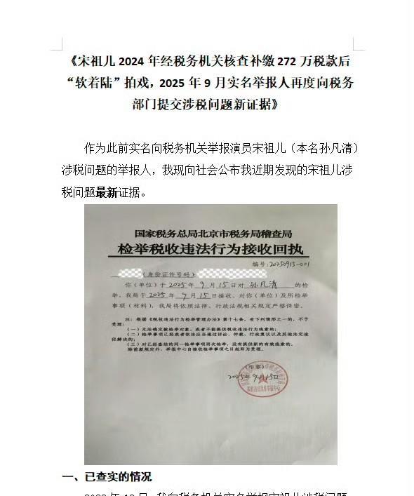 之前实名聚宝宋祖儿的那位,再度向税务机关提交了新证据。[吃瓜群众] 并艾特宋祖儿及其工作室 称:瞒天过海岂能蒙混过关?铁证如山终将真相大白!陪你一直走下去。 所以,是什么情况啊???不是已经补缴过了才复出拍戏吗[吃瓜群众] #宋祖儿# #宋祖儿偷税案件#