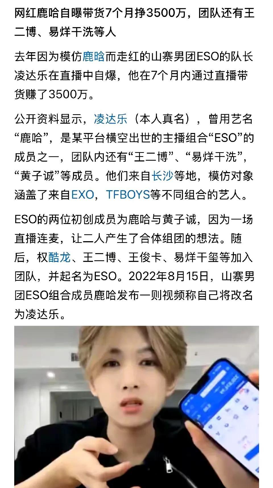 模仿黄子韬走红的网红黄子诚破产了,他为了将流量变现,变卖了全部家产全部投入山寨男团ESO,但是没想到因为过度模仿账号被封禁,导致投资全部打水漂,直接破产了。 但他不认为自己有问题,称只是娱乐,算不上过度模仿,也没损害黄子韬名誉,称账号被封禁是因为别人羡慕妒忌恨他走红,然后举报他,导致他被平台打压,被资本做局。 网友对他的说法嗤之以鼻,称他是“未经他人苦,却沾他人光”,怒斥他“想走捷径没成功却扯上黄子韬”,还拿他和赚了几千万,模仿鹿晗的鹿哈相比,认为他的失败有多方面原因,一是他个人魅力和才华不足,单纯模仿很无趣,二是颜值差鹿哈太多,三和没有像鹿哈一样在流量最高时急流勇退选择做自己。网友们说得很对,一时的模仿只能带来短暂的流量,要想留住粉丝,还得靠自身魅力与才华,还有情商。