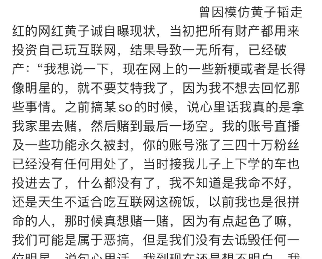 模仿黄子韬走红的网红黄子诚破产了,他为了将流量变现,变卖了全部家产全部投入山寨男
