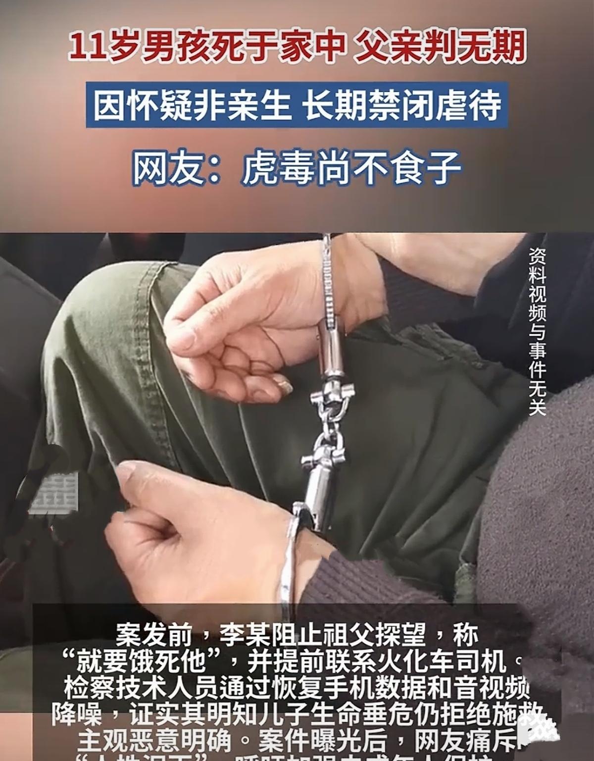 山东,父母离婚后,4岁男孩跟爷爷生活了4年,8岁时被父亲接走。然而父亲并不是接回去悉心照料,而是怀疑他非亲生,对他进行了长达3年的虐待,在11岁时连饿2个月后,已不会走路。爷爷非要看下孙子,父亲就说一拳把他打死!第二天可怜的孩子死亡。事发后警方介入,检方技术手段恢复了他手机删除部分后,查明他的暴 虐,法院做出了最终判决! 2023年4月26日,11岁的小李永远停止了呼吸。这个本应在校园里追逐嬉戏的孩子,最终倒在了亲生父亲李某的长期暴 虐下。 2012年,小李的降生曾为家庭注入短暂的暖意。 然而2016年,李某与妻子的婚姻破裂,离婚后,两人拍拍屁股都走了,把4岁的孩子扔给年迈的爷爷老李抚养。 幼小且懵懂无知的小李,不懂父母的离开意味着什么! 李大爷出于对孙辈的疼爱,用悉心照料为小李搭建起临时的避风港,让他在缺失父母陪伴的日子里,仍能感受到温暖。 小李8岁时,父亲李某突然来接他,李大爷虽不舍孙子走,可一想自己年龄越来越大,早晚也得回亲爹那边,父子俩得增进感情,亲爹亏不了孩子! 他万万没想到,这一送,竟是把孙子推向了地狱。 李某把儿子接回来后,或许是生活的不顺与过往的怨怼中滋生出扭曲心理,小李逐渐成为他宣泄负面情绪的目标。 2022年10月,李某的心理扭曲彻底外化。无端猜忌小李非亲生的念头,如同毒藤缠绕其心智,让他将对前妻的怨恨、对生活的不满尽数转嫁到孩子身上。 先是不让孩子上学,把他关在家里不让出门,不让他接触到外人,彻底切断了小李和外界的联系。 老李每次想去看孙子,都被李某堵在门外,连句孩子的消息都问不到。 他只能隔着门喊孙子的名字,可里面静悄悄的,回应他的只有李某的咒骂。 事发前一晚,老李硬闯进去,发现孙子已瘦得脱了形。李某在一旁恶狠狠地说:俩月没给他吃饭,连路都走不了,我就是要饿死他! 老李哭着求他,让把孩子接走自己去养,李某却威胁道:你敢动?我一拳就能打死他。 老李怕孙子受到更大伤害,只能就罢。 然而2023年4月26日,也就是爷爷想见孙子的第二天,小李就死于房中。 很快警察得知消息上门,以过失致人死亡罪对其立案侦查。 李某居然没有一点恐慌,一脸平静。 李某家门口监控,事发前后的画面模糊、声音嘈杂,根本提供不了线索。 然而侦察人员用技术手段把音视频清晰化、降噪处理后,一段对话让人毛骨悚然。 警察要查李某手机,他说手机坏了。可经技术修复后发现,手机数据被删了。 把删除部分再次恢复通话记录后更吓人,事发前两天和当天,李某居然三次联系火化车司机,提前说家里有人快不行了,先预约着。 李某在孩子弥留之际,竟提前联系火化车。 李某的辩护人还想狡辩,说小李本身有疾病,不能全怪李某。一开始的死因鉴定也有点含糊,说孩子是营养不良加急性坏疽性胆囊炎死的。 好在检察技术部门的法医联合复查,发现了问题:鉴定里说的胆囊炎,根本没取胆囊做病理检验,就看了眼颜色就下结论。 判定营养不良的关键项目没做;孩子身上10多处新旧伤痕,也没说和死因的关系。 重新鉴定后,真相终于大白:小李是长期营养不良导致重度肝脂肪变性,引发多器官功能衰竭死的,身上的伤都是虐待留下的,胆囊根本没病变。 检察机关通过多种技术手段辅助认定,李某作为小李的监护人,明知其生命垂危拒不救助且阻止他人施救,导致他死亡,以故意杀人罪公诉。 《刑法》第232条规定:故意杀人的,处死刑、无期徒刑或者10年以上有期徒刑;情节较轻的,处3年以上10年以下有期徒刑 。 李某期虐待小李,不让其上学、关在家中、不给他饭吃、对他进行殴打,在小李生命垂危时,明知其状况却拒不救助且阻止他人施救,还提前联系火化车,其行为表明他对小李的死亡结果持放任态度,主观上具有间接故意,客观上实施了导致小李死亡的行为,符合故意杀人罪的构成要件。 《刑法》第260条规定:虐待家庭成员,情节恶劣的,处2年以下有期徒刑、拘役或者管制。犯前款罪,致使被害人重伤、死亡的,处2年以上七7以下有期徒刑。 李某对小李实施了长达3年的摧残虐待行为,包括不让上学、限制自由、饥饿、殴打等,这些行为属于对家庭成员从肉体上和精神上进行摧残、折磨,且情节恶劣,符合虐待罪的构成要件。 但由于李某的行为最终导致小李死亡,且其主观上存在故意,因此应按照故意杀人罪定罪处罚,而不再单独认定为虐待罪。 法院审理认为:李某因为无端猜忌,长期虐待孩子,这些行为和小李的死亡有直接因果关系,而且他早就明知孩子快不行了,还提前联系火化车,主观恶意极其明显。 最终法院判决:李某犯故意杀人罪,判处无期徒刑,剥夺政治权利终身。 李某太暴虐!常言道:虎毒尚不食子!连亲生骨肉都能下此狠手,这样的人,不配为人父,更不配做人! 可怜的孩子,希望他来生找对父母! 对此您怎么看?
