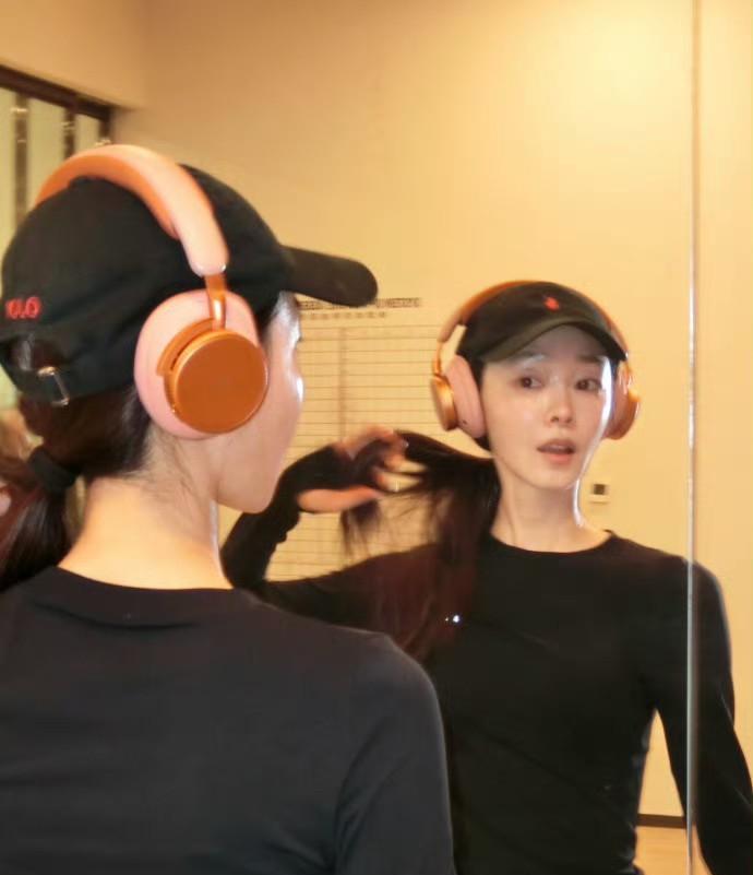 宋轶素颜健康还能美成这样? 一身黑色运动装,戴着棒球帽和显眼的橙色耳机,在跑步机