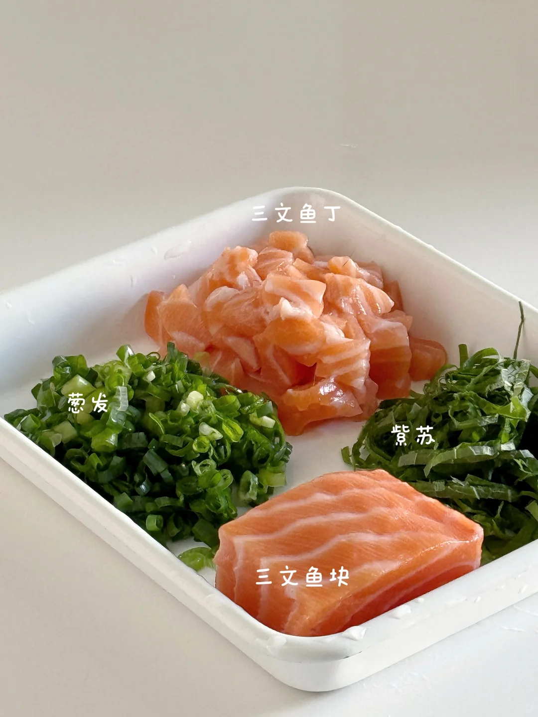 三文鱼切丁和紫苏一起拌饭