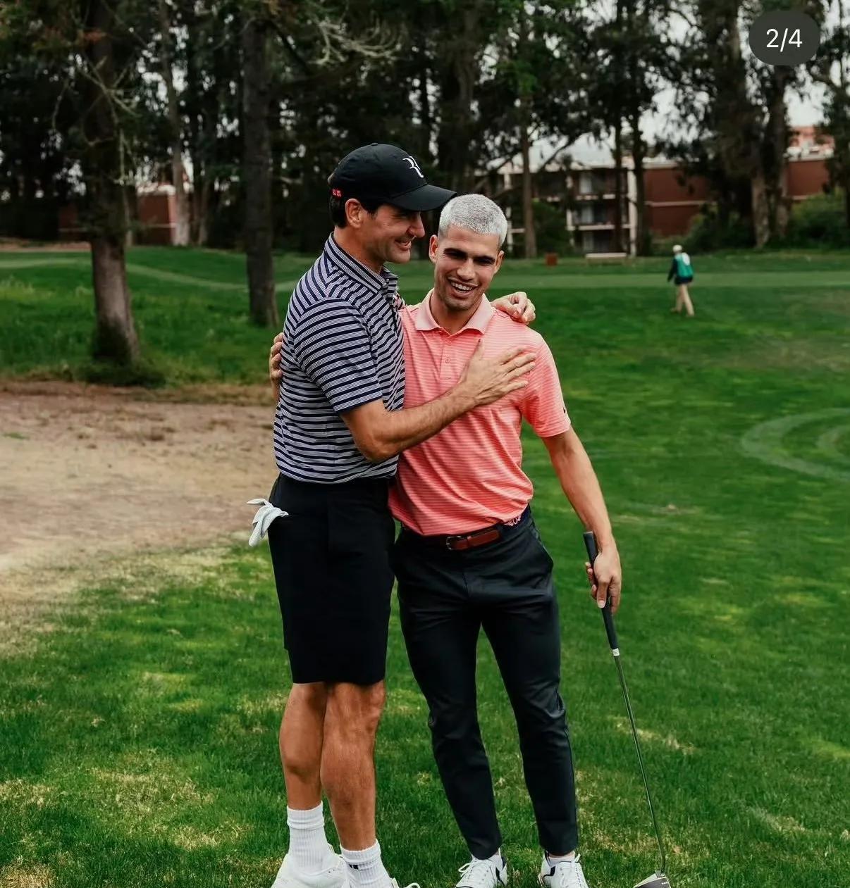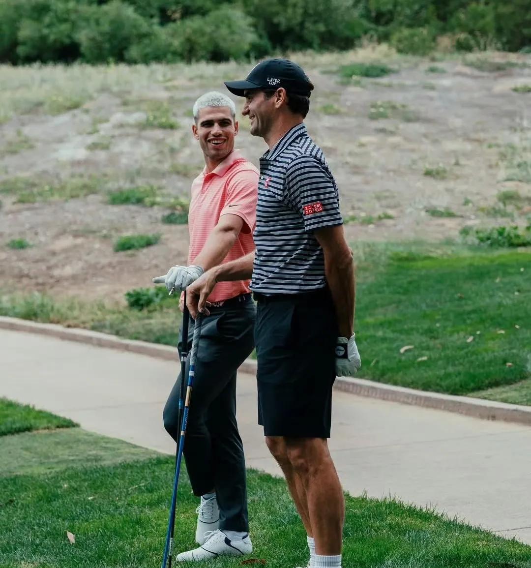 费德勒和阿卡同框,两人一起去打高尔夫球了。 一个是名满天下的四巨头之一,拿冠军拿