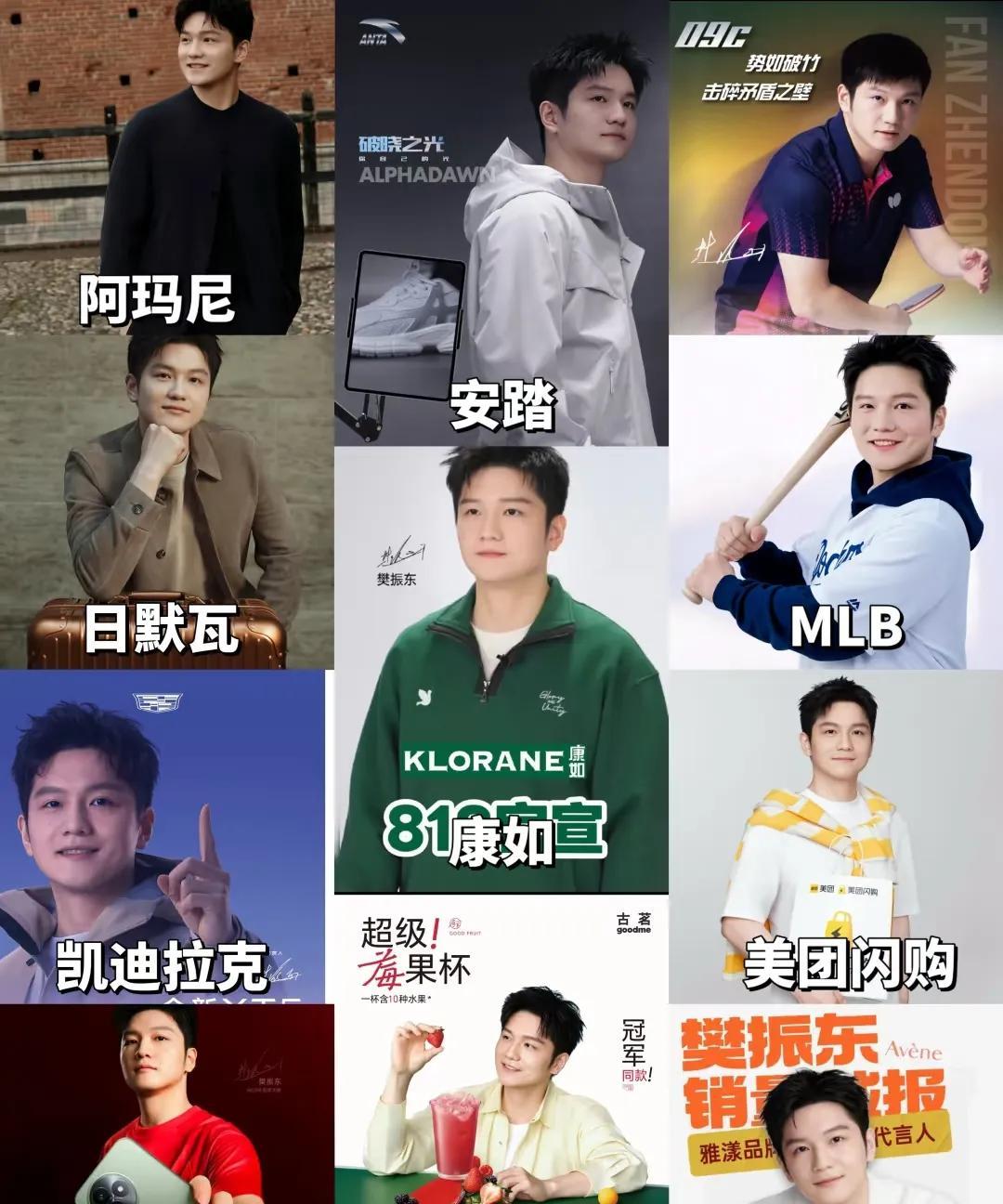 你发现了吗?现在的樊振东真是代言起飞,涉及领域真是深入到了生活的角角落落。 试想一下: 早晨起来用“康如”洗个头、 用“笑容加”刷个牙, 洗嗽完用雅漾、倩碧和玉泽护肤, 听着“红米”手机的音乐, “美团闪购”一份早餐, 再来一杯醒神的“雀巢”咖啡, 早餐后穿上“安踏”运动衣、 背上“日默瓦”包包, 开上“凯迪拉克”汽车, 美美滴出门啦! 真的不要太完美啦。
