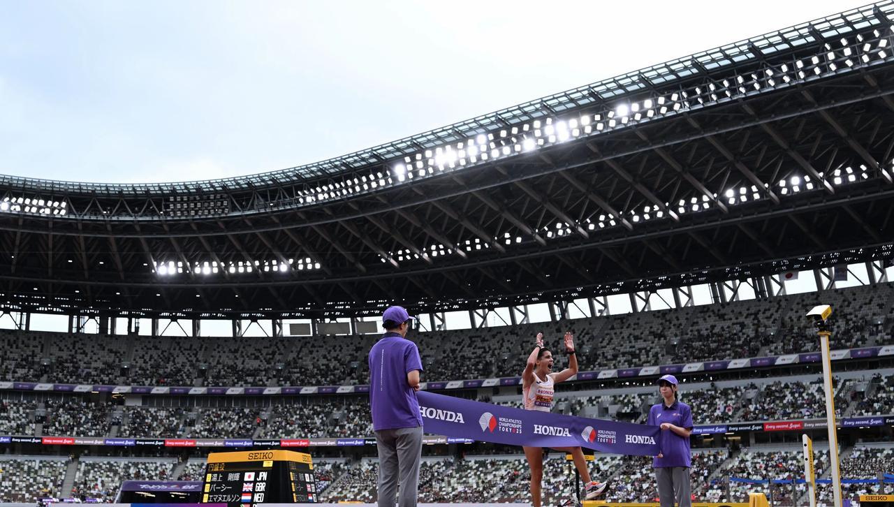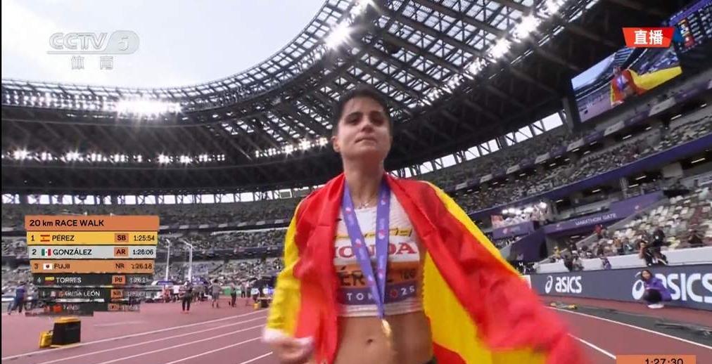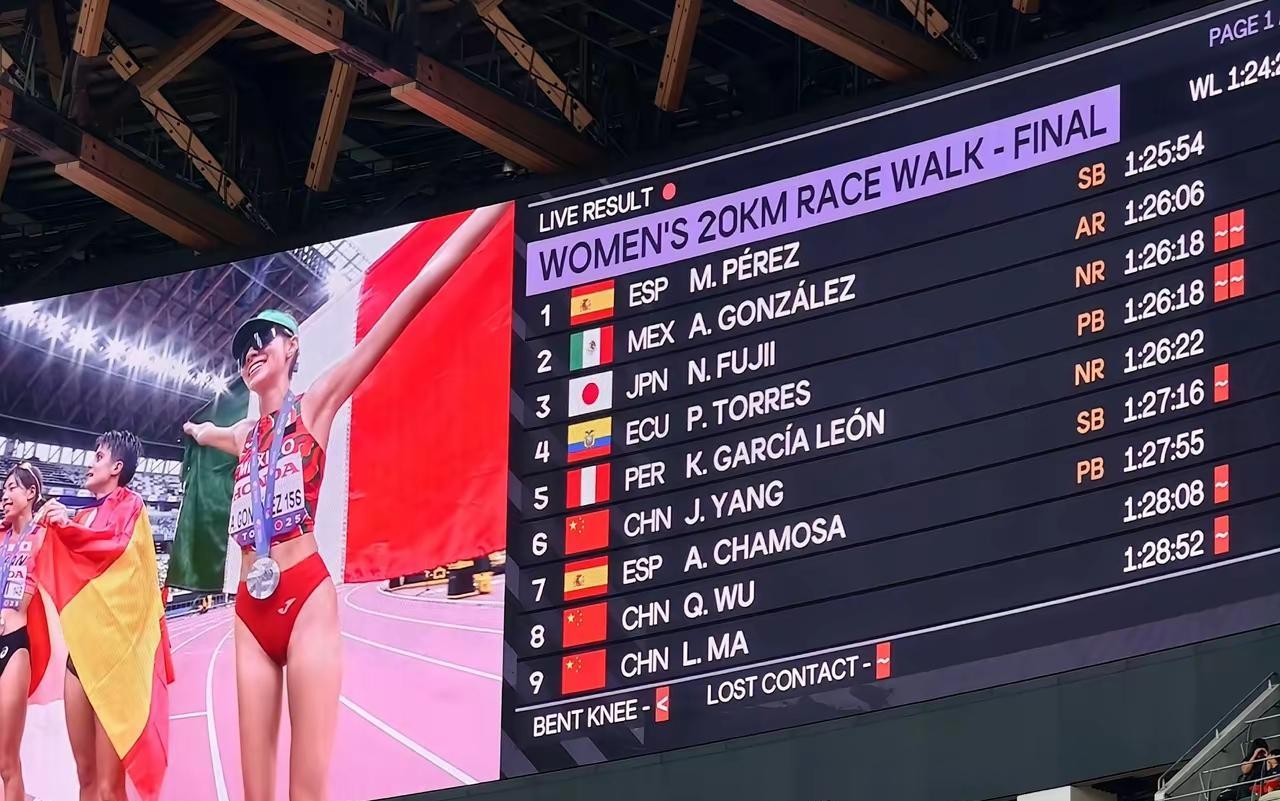刚刚结束的东京田径世锦赛女子20公里竞走比赛,中国队有四人参赛,已经拿到35公里冠军的西班牙老将佩雷兹在16公里过后就遥遥领先于其他选手,杨家玉等中国选手也都被甩开,最终佩雷兹以1小时25分54秒成功卫冕,再次包揽女子竞走的两项冠军,墨西哥和日本选手分获银牌和铜牌,奥运冠军杨家玉以1小时27分16秒的赛季最好成绩获得第6名,吴全明以1小时28分08秒名列第8,马丽以1小时28分52秒名列第9,另一名中国选手彭丽在剩下不到6圈时因累计四张红卡被罚下场,中国队在又一个冲金点折戟沉沙。