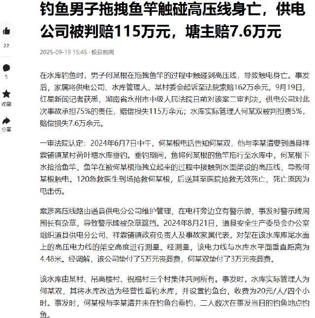 “在水库钓鱼,出事了!”湖南永州,何某根在水库钓鱼时,拖拽鱼竿碰到高压线触电身亡。家属起诉供电公司、水库管理人何某双和某村 委 会索赔162万余元。 事情发生在二零二四年六月七日这天,何某根拨通了何某双的电话,老何,我和李某清打算去你那霖铺镇某村荷叶塘水库钓鱼,行不? 何某双在电话那头应声说行,不过,我这个水库现在改成经营性垂钓地了,有钓鱼台,20块钱能钓四个小时。 何某根和李某清到了水库,瞅了瞅钓鱼台,觉得人太多,不够清净,就选了水库边一个偏僻的地。他俩支好鱼竿,甩下鱼饵,就眼巴巴地盯着水面。 何某根的鱼竿猛地一沉,有鱼上钩了!他兴奋地大喊,哟呵,这鱼劲还不小!说着,就用力往上拽。可这鱼太狡猾,把鱼竿拖进了水库。 何某根哪肯罢休,衣服都没脱,扑通一声就跳进水里。他在水里摸索着,好不容易抓住鱼竿,用力往上拖。 就在他把鱼竿拖出水面的时候,突然,一阵滋滋的电流声响起,何某根浑身一颤,整个人直挺挺地倒在水里。李某清在一旁吓得大声呼救,快来人,救命! 有人打了120,急 救 医 生 赶到现场,对何某根进行抢 救。可最终,还是没能把他救回来,离世的原因是电击伤。 原来,这水库上方架着高压线,归道县供电分公司管。电杆旁虽然有警示牌,可事发时,警示牌被周围的杂草挡得严严实实,根本起不到警示作用。 而且,经过测量,高压电线离水库水平面垂直距离才4.48米,比规定的5米还低。 事发后,道县供电分公司垫付了5万元丧葬费,何某双也垫付了3万元。 可何某根的家属觉得这事不能就这么算了,他们一纸诉状起诉了供电公司、何某双还有某村 村 委 会,索赔162万余元。 1,供电公司,是否应承担此次事故的主要责任呢? 依据《民法典》第一千二百四十条规定,从事高空、高压、地下挖掘活动或者使用高速轨道运输工具造成他人损害的,经营者应当承担侵权责任;但是,能够证明损害是因受害人故意或者不可抗力造成的,不承担责任。被侵权人对损害的发生有重大过失的,可以减轻经营者的责任。 本案中,高压电线离水库水平面垂直距离才4.48米,低于规定的5米,且电杆旁警示牌被杂草遮挡,无法起到警示作用。 供电公司作为高压线的经营者,未尽到安全保障义务,对事故发生存在重大过错,理应应承担主要责任。 2,何某双在此次事故中,要承担什么责任呢? 何某双将水库改成经营性垂钓地,收取费用,有义务保障垂钓者的安全。 然而,他未对水库周边的安全隐患进行有效排查和管理,警示牌被杂草遮挡也未及时处理,对事故发生存在一定过错。 根据《民法典》第一千一百九十八条规定,宾馆、商场、银行、车站、机场、体育场馆、娱乐场所等经营场所、公共场所的经营者、管理者或者群众性活动的组织者,未尽到安全保障义务,造成他人损害的,应当承担侵权责任。 所以,何某双应承担相应责任。 3,何某根,自身有没有过错呢? 何某根作为完全民事行为能力人,在钓鱼时应当对周围环境进行观察和判断。 明知水库上方有高压线,却选择在偏僻且可能存在危险的地方钓鱼,在鱼竿被拖入水中后,又贸然下水捞取,对自身安全疏忽大意,对损害的发生存在过错。 根据法律规定,可减轻侵权人的责任。 综上,一审经过审理,认定损失153万余元,觉得供电公司和何某双都有责任,何某根自己也有过错。一审判决后,供电公司不服,提起上诉。 9月19日,二审维持了原判,供电公司担75%责任,赔115万余元,扣除已付的还得赔110万余元;何某双担责5%,赔7.6万余元,扣除已付的赔4.6万余元。 何某双为了赚钱,把水库改成垂钓地,却没把安全措施做好,警示牌被杂草挡住,这不是明摆着给人挖坑吗? 供电公司,高压线离水面那么近,还让警示牌失效,这不是失职是啥? 可话说回来,何某根自己也有问题。明知道水库上方有高压线,还非要往危险的地方凑,这不是拿自己的命开玩笑吗? 要是他能在钓鱼前多观察观察周围环境,或者选择在安全的地方钓鱼,也许就不会发生这样的悲剧了。 村 委 会 也有责任,水库在他们辖区内,他们难道就没发现安全隐患吗?就这么看着何某双把水库改成垂钓地,也不管管? 对此,你怎么看呢? 信源:极目新闻2025-09-19 15:45 钓鱼男子拖拽鱼竿触碰高压线身亡,供电公司被判赔115万元,塘主赔7.6万元