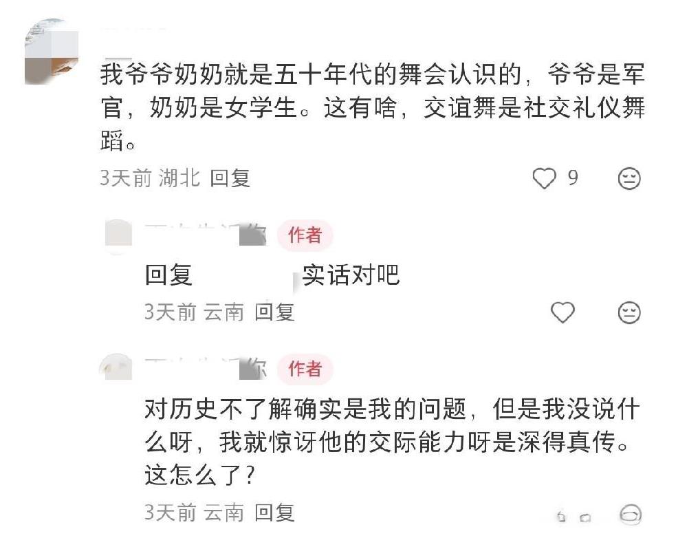黑子自己也没想到吧?含沙射影带节奏指向张兰的妈妈,没想到评论区翻车了。 张兰的妈妈年轻时参加舞会,黑子大概以为拿到了什么不得了的黑料。没想到被评论区集体教育了。 评论区说,在那个年代,跳舞就只是跳舞,是一种很正常很时髦的社交活动,并不像某些人脑子里想的那样。好的单位都有舞厅,在当时代表先进和文明。 根据这些亲历过的网友的描述,跳交谊舞是社会主义新中国一种健康的大众文娱活动,它丰富了人们的业余生活。不知道黑子要表达什么,引导什么。 看来,不管干什么,都要具备一定的文化修养和认知水平,否则目的没达到,反而暴露了自己的无知。#汪小菲#