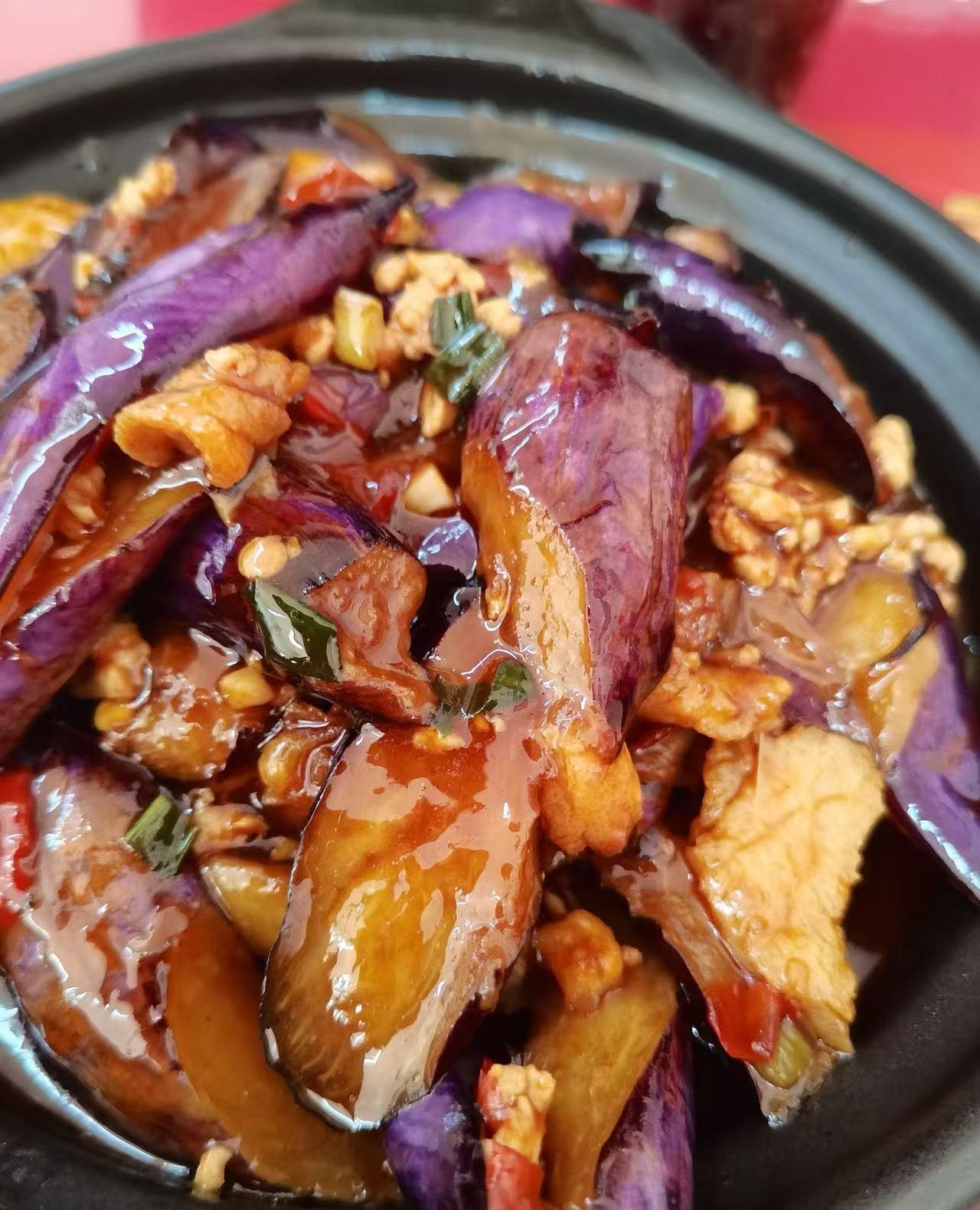 2️⃣.油焖茄子煲,茄子充分吸收了酱汁的味道,微甜的口感很下饭。