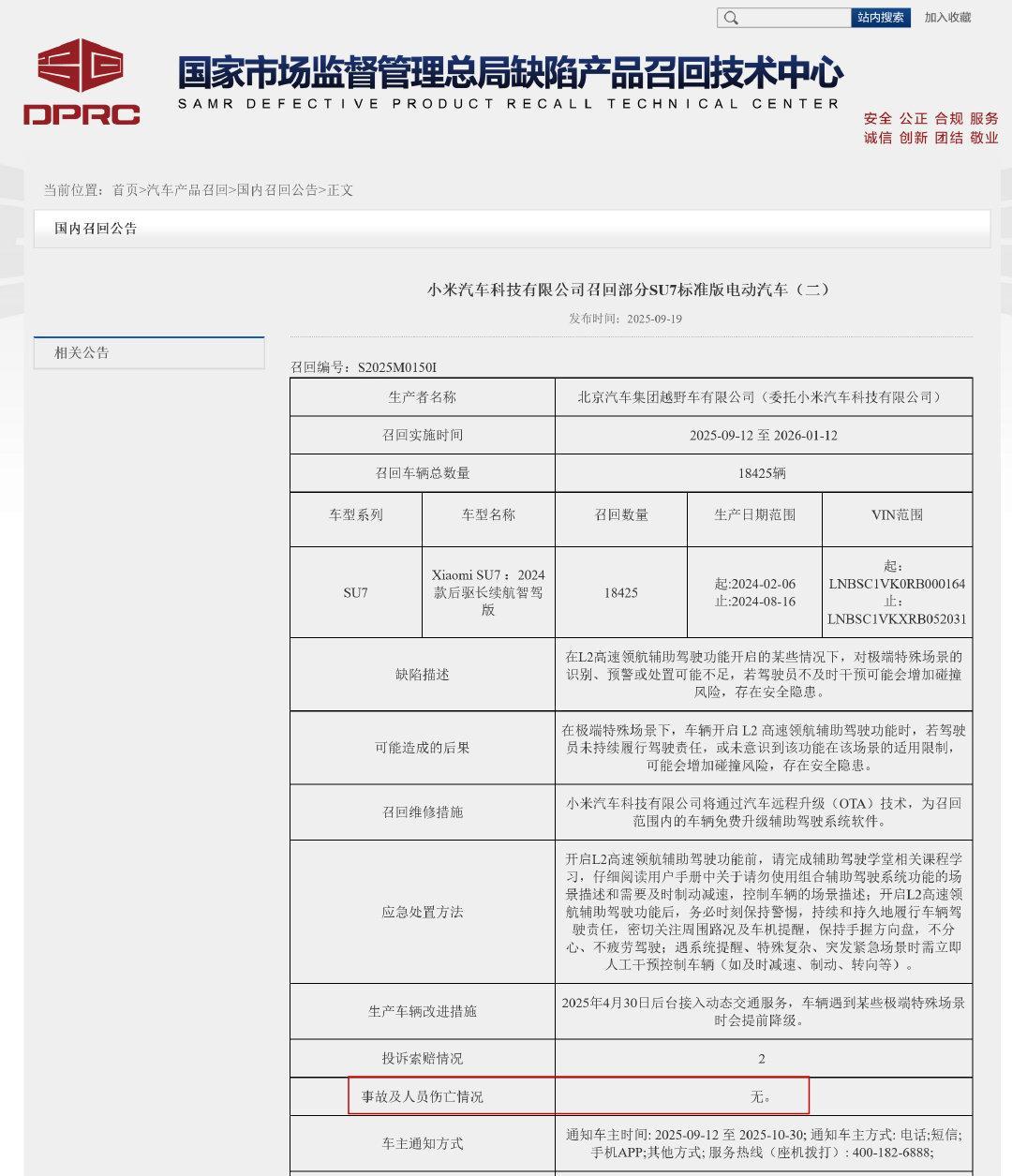 有博主发现,小米此次主动召回是因为有6个车主投诉举报。 伤亡人数0。 [吃瓜群众
