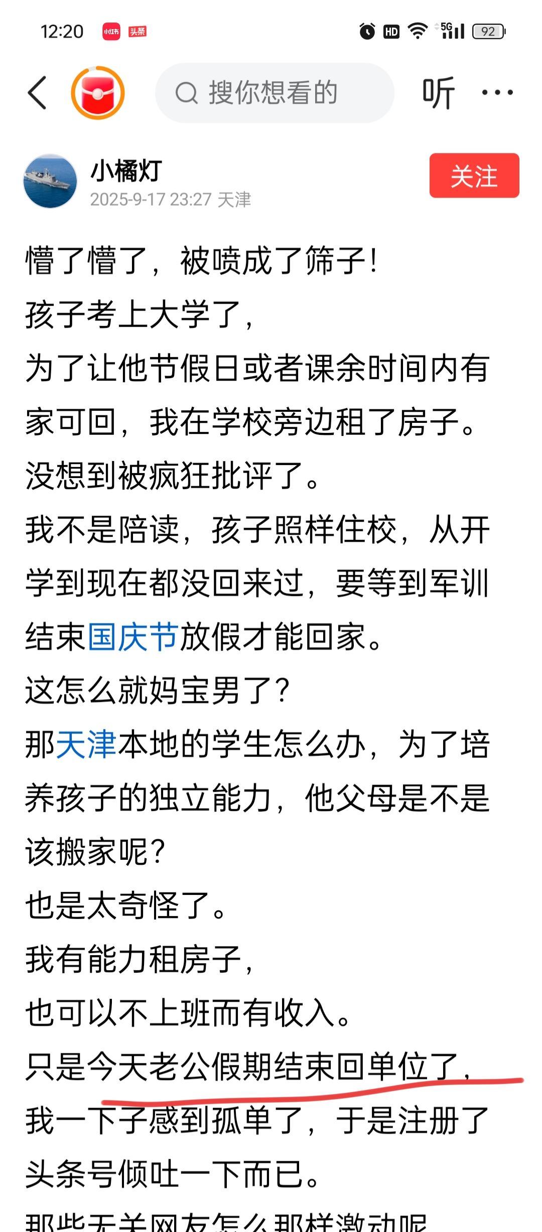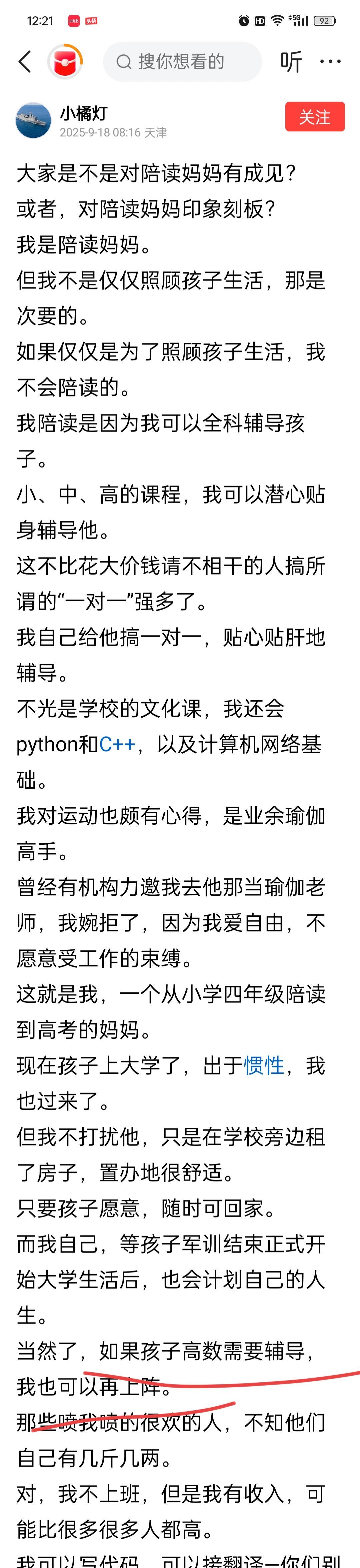 为啥我讨厌全职妈妈 这个全职妈妈,千万个全职妈妈中的一个,真的让我看到了寄生虫的嘴脸 她说辅导孩子,孩子只是压线上本科 她说家里有钱,可以租的起房子,给上大学的儿子陪读,但是,她老公还是去上班,没有和她一起躺平享福 最可笑的,她还说自己将来可以辅导别人家的孩子 其实,现实是 孩子考上大学和她无关,和全职更无关,有全职妈妈家庭,孩子一下子都抑郁了的,也有双职工家庭,孩子上清华的。 她所谓的有钱,大概率,只是她老公上班挣得而已。当然,她们会说,“我老公愿意”。那么真的想问问,她老公想不想要一个和他分担点女人? 有时候只是全职妈妈的老公没办法,找不到更好的女人而已