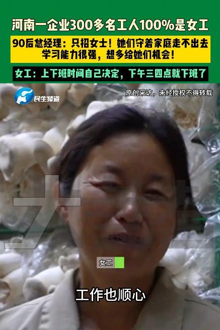河南濮阳,90后男子经营一家企业,全厂300多工人竟然清一色全是女工。工作上下班居然根据女工们的时间灵活调整。男子:他们守着家庭出不去,想多给她们机会。 在河南濮阳一座不起眼的工业园区里,每天清晨都能看到一群身着蓝色工装的女工步履匆匆地走进厂房。 她们中有人刚送完孩子上学,有人怀里还揣着给老人准备的降压药,但当她们戴上手套站到流水线前时,眼神里立刻浮现出专注与自信。 2018年,刚从农业院校毕业的袁帅回到家乡濮阳,决心在菌菇种植领域闯出一片天地。 当他在招聘会上看到众多中年女性因“需要照顾家庭”被拒之门外时,内心受到强烈触动。 “这些大姐们每天凌晨就要起床准备一家人的饭菜,送完孩子还要去菜市场采购,她们的时间就像被掰成了碎片。” 袁帅回忆道,“但她们学习新技能时的认真劲儿,比很多年轻人都强。” 在亲友的质疑声中,袁帅做出了一个大胆决定:这家工厂只招女工。 消息传开后,前来应聘的女性络绎不绝,甚至有人从百公里外的县城赶来。 走进工厂的中控室,墙上的电子屏实时显示着各条生产线的进度。 与传统工厂不同的是,这里没有固定的上下班打卡机。 “我们实行的是‘任务包干制’,只要完成当天的生产指标,女工们可以自行安排时间。” 袁帅介绍道,“有的大姐要接孩子放学,就上午多干些;有的阿姨要照顾住院的老人,下午可以提前走。” 然而就是这种看似松散的管理模式,却创造出惊人的生产效率。 更令人惊喜的是女工们的技能突破,在叉车操作区,38岁的张丽霞正驾驶着叉车精准地搬运货物。 张丽霞表示,工厂专门请了老师傅手把手教学,现在她不仅考取了叉车证,还能在10分钟内完成一车货物的装卸。 在工厂的研发实验室里,28岁的技术员赵丽正在调试培养基配方。 谁能想到,这个曾经连电脑都不太会用的全职妈妈,如今已经能独立完成菌种培育工作。 企业的暖心举措也换来了员工的忠诚。 在工厂的荣誉墙上,挂满了“年度优秀员工”的照片,其中工龄最长的王桂兰已经在这里工作了7年。 这种双向奔赴的信任,让企业在市场竞争中脱颖而出。 如今,这家工厂的产品不仅畅销国内20多个省份,还出口到东南亚和中东地区。 2024年,企业年产值突破1.2亿元,带动周边3000多户农户增收。 在濮阳市华龙区的社区服务中心,一面“就业帮扶示范基地”的锦旗格外醒目。 这里定期举办针对宝妈群体的技能培训班,课程内容从直播带货到家政服务,应有尽有。 这种“培训+就业”的模式,正在濮阳全市推广。 截至目前,已有超过2000名女性通过这种方式实现了家门口就业。 “以前总觉得照顾家庭和工作是矛盾的,现在才发现,只要企业多一些理解,女性完全可以兼顾好两边。” 从田间地头到现代化厂房,从家庭主妇到技术能手,濮阳这家全女工企业的实践证明:女性的价值从来不应被家庭所局限。 当社会给予她们更多包容与支持,当企业为她们创造合适的平台,每一位女性都能在生活的舞台上绽放出属于自己的光芒。 信息来源:大参考2025-09-19发布视频
