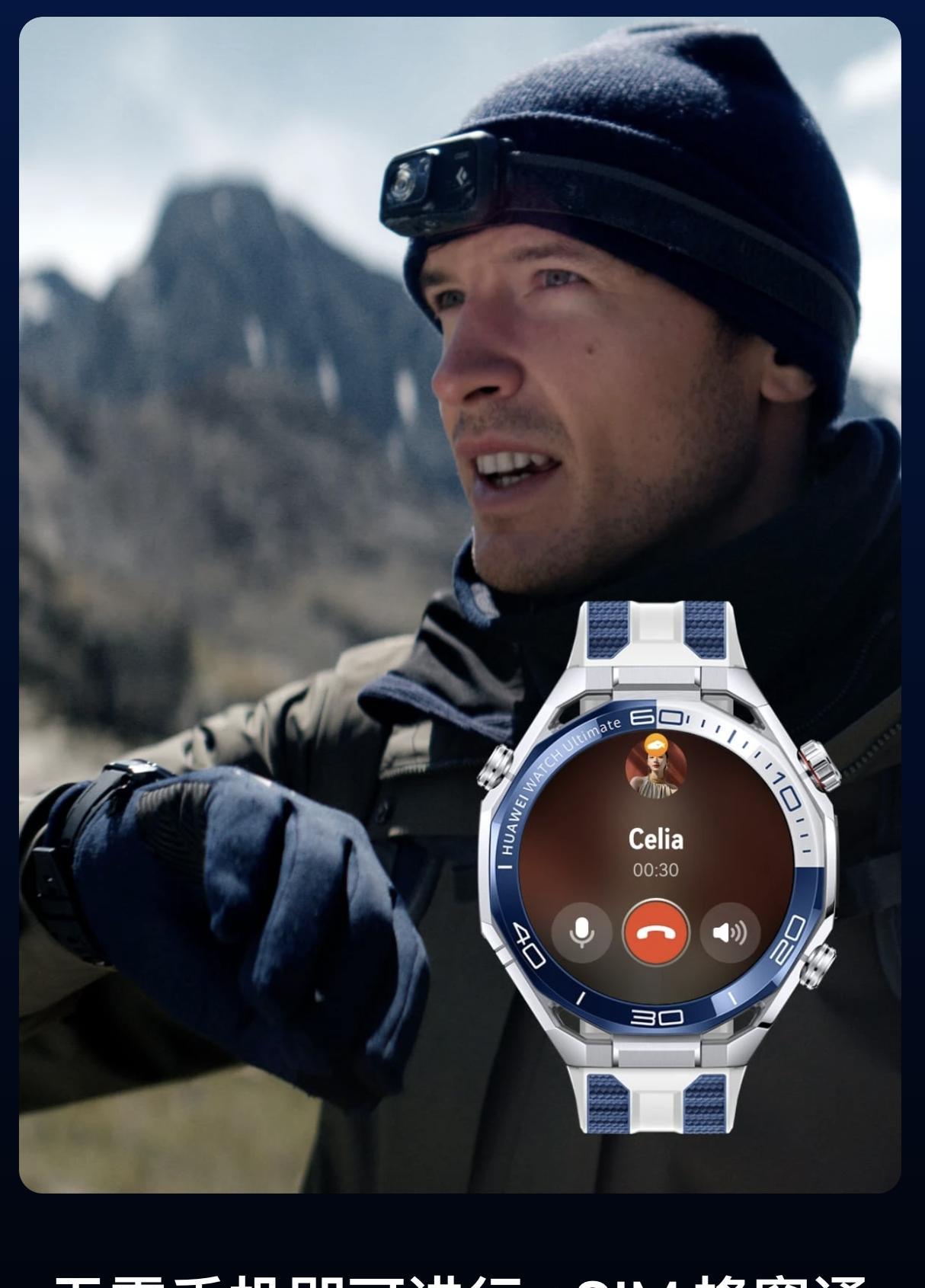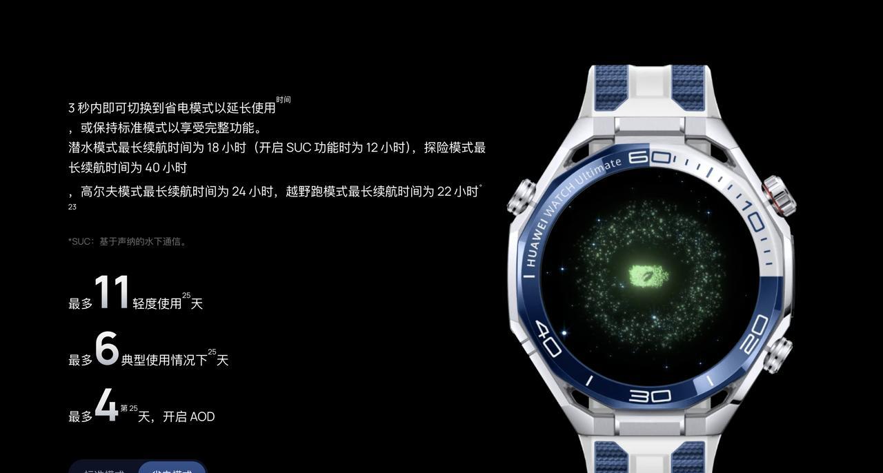 华为 WATCH Ultimate 系列终于也更新了,首发基于独立声纳的水下通信解决方案,内置声纳模块可实现最远 30 米的信息交换。Ultimate 初代发布于 2023 年,2024 没出二代只出了一款「绿野传奇」,应该让不少 Ultimate 花粉望眼欲穿了,目测国行价格还是 5999 元。[不愧是你] - 屏幕:1.5 英寸 466×466 OLED 屏幕,LTPO 2.0,PPI 310,户外峰值亮度 3500nit,蓝宝石玻璃表镜; - 尺寸:「驰骋山地」为 48.5×48.5×12.9mm,「纵横海洋」为 47.8×47.8×12.9mm,重 80.5g(不含表带),非晶锆合金表体 + 纳米微晶陶瓷背壳; - 传感器:新增 X-TAP 智感窗,多合一超感知模组指尖检测; - 防护性:20 ATM 防水,IP68 & IP69 防尘防水,支持最大深度 150 米的潜水运动; - 连接性:NFC、蓝牙 5.2、双频 GPS 双频北斗,支持星闪,华为向日葵定位系统,新增基于声纳的水下通信,支持 eSIM;国行预计支持双向北斗卫星消息; - 续航:硅碳负极电池,能量密度提升 37%,省电模式轻度实用续航可达 11 天、常规使用场景续航可达 4.5 天(连接 iPhone 为 3.5 天)、开启表盘 AOD 常亮显示续航可达 3 天(连接 iPhone 为 2.5 天),潜水模式关闭声纳水下通信时为 18 小时 / 启用声纳水下通信时为 12 小时,20W 无线充电; - 运动和健康:华为玄玑感知系统,超感知模组(多光路分区设计 + 多通道光路架构 + 超隔光玻璃工艺),全新骑行模式,支持高尔夫、自由潜水、越野跑等专业运动模式,支持高尔夫球场地图、支持情绪健康管理。增加动态视频表盘。