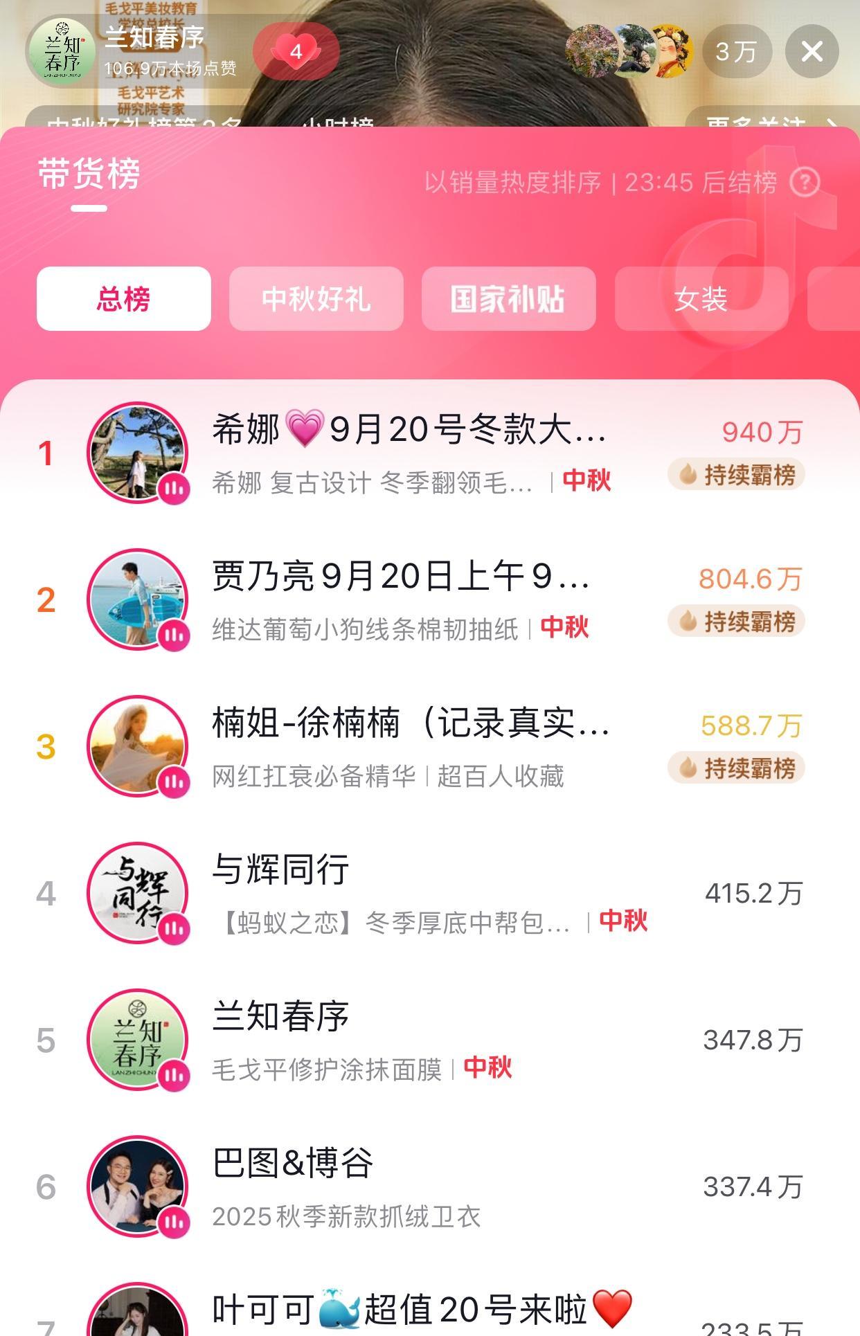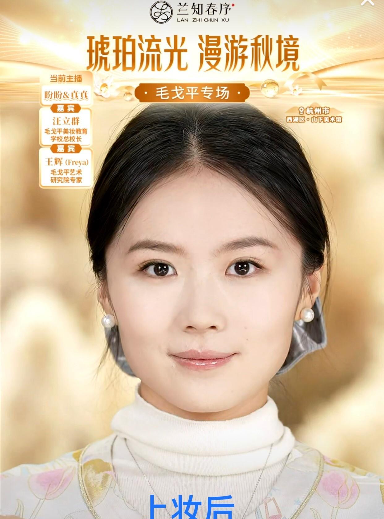 今天兰知春序是毛戈平专场 真真没打底妆之前和打底之后做了对比 效果还是挺明显的,以前听过毛戈平 这次算是比较系统的做了个介绍 他们的妆还是很自然清透的 盼盼也用了,看着确实不太一样 请来的两位嘉宾气质挺好 介绍的很专业 直播间里有4万人在线 兰知春序上了抖音带货榜第五 这对一个刚成立3个多月的直播间来说