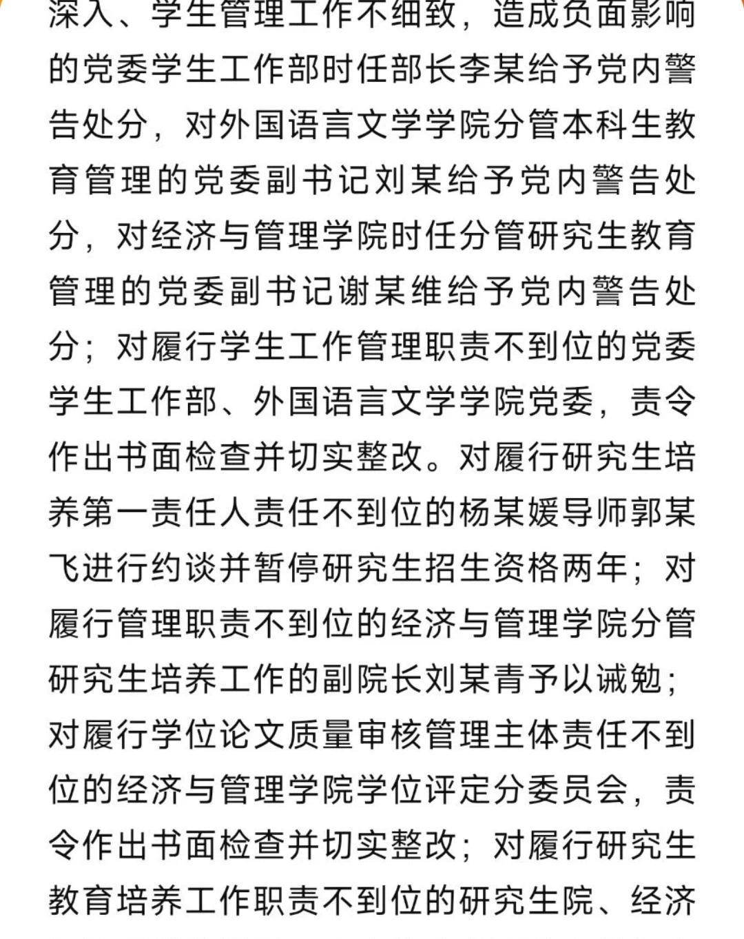想问武大的领导: 第一,杨某媛硕士毕业论文中提到“离婚法”,中国没有这部法律,这还不是出自杨某媛的“主观造假”?这是不规范问题吗? 第二,因为杨某媛处分了这么多老师,如果她的毕业论文没有问题,那么这些老师也没有问题,为什么要处分? 第三,既然处分了老师,证明杨某媛有错误,她的老师才有错误,无论是在处理肖同学所谓性骚扰事件上还是她的毕业论文上,为何杨某媛毫发无损? 杨某媛没有一点点需要承担的责任,她的硕士毕业论文合格通过,你们还赞她的论文有新意,是指女性主义论文这种新意? 她的硕士学位继续保留,她的所谓“性骚扰”被法院驳回,也不用承担任何责任,说明她没有一点点过错,那你处分这些老师做什么? 总结就是,她杨某媛想怎么玩就怎么玩?不需要承担任何责任,这一场闹剧武大所有人都是陪她玩的吗?