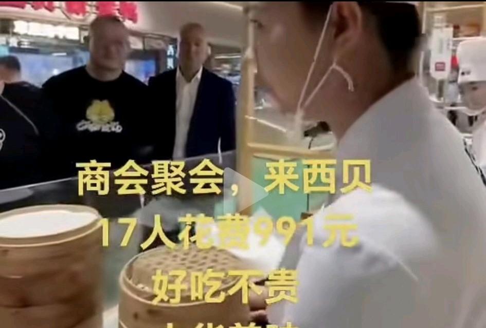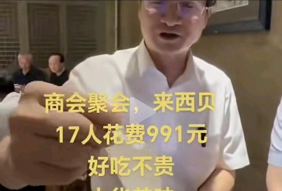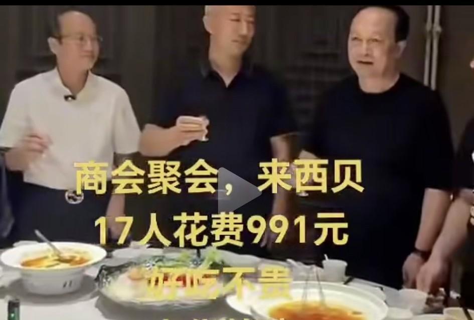 十多个城市商会的会长和秘书长, 共十七个人, 浩浩荡荡的来西贝吃饭, 表示对西贝的支持。 17个人吃了991元。 桌上菜品不多, 我不知道这十七个人, 吃这区区几个菜能否吃饱。 是不敢多吃? 还是真的有钱人饭量小? 吃完后还自己采访自己人, 个个都夸西贝好, 好吃不贵, 又采访做筱面的女员工。 对自己做的筱面满意度怎么样, 自己评个分, 女员工脱口而出:十分。 后面这些会长们又一通吹捧, 看得我浑身直起鸡皮疙瘩。 看来贾国龙这个中餐协会副会长的影响力,还是蛮大的。 不过,不知道这些会长们, 这好吃不贵的菜品, 和顾客吃得是同一种食材吗? (网络视频截图,个人观感)