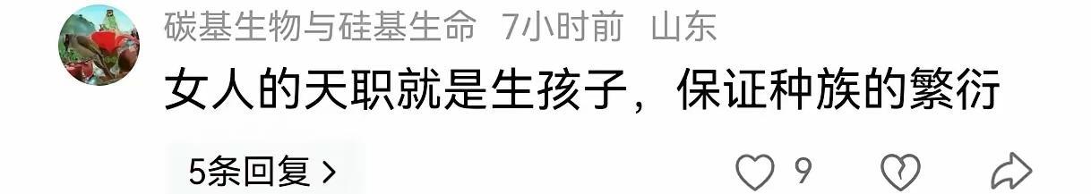 某女的观点 女人拿生育价值,和男人换车换房怎么了? 女人优秀的多了,不生孩子也拼的过男人 第一,生育是老天给的,你可以说不公平,然后不结婚生育,但是,你拿这个换钱,你不怕老天不满意吗? 第二,我一直认为女人和男人一样优秀,但是,这种优秀是要承担义务的。不是你嘴上说着优秀,实际上还是婚前一分钱不出,婚后靠老公养。 不是要求生孩子的男人,一定是耀祖,而是正常人都默认,结婚和生孩子是连在一起的 你确实不是耀祖,因为,你父母也没把你当做家人,你也没把自己当做独立个体