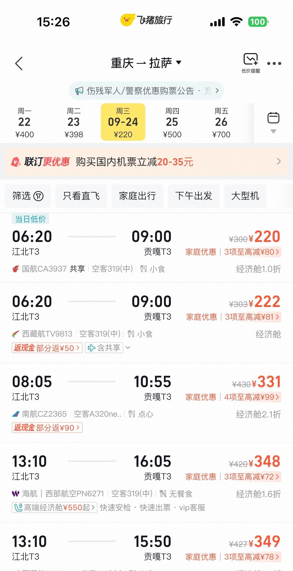 我的个天啊!最近,重庆飞拉萨,最低只要200块钱出头!9月24日,重庆飞拉萨,国