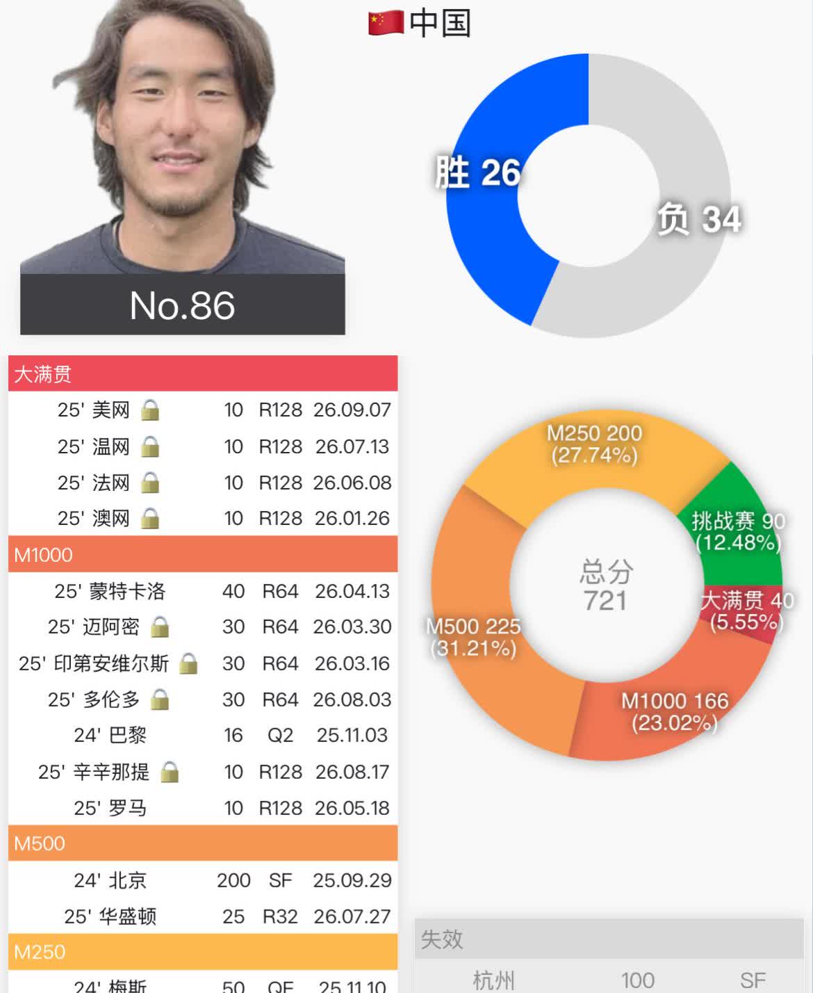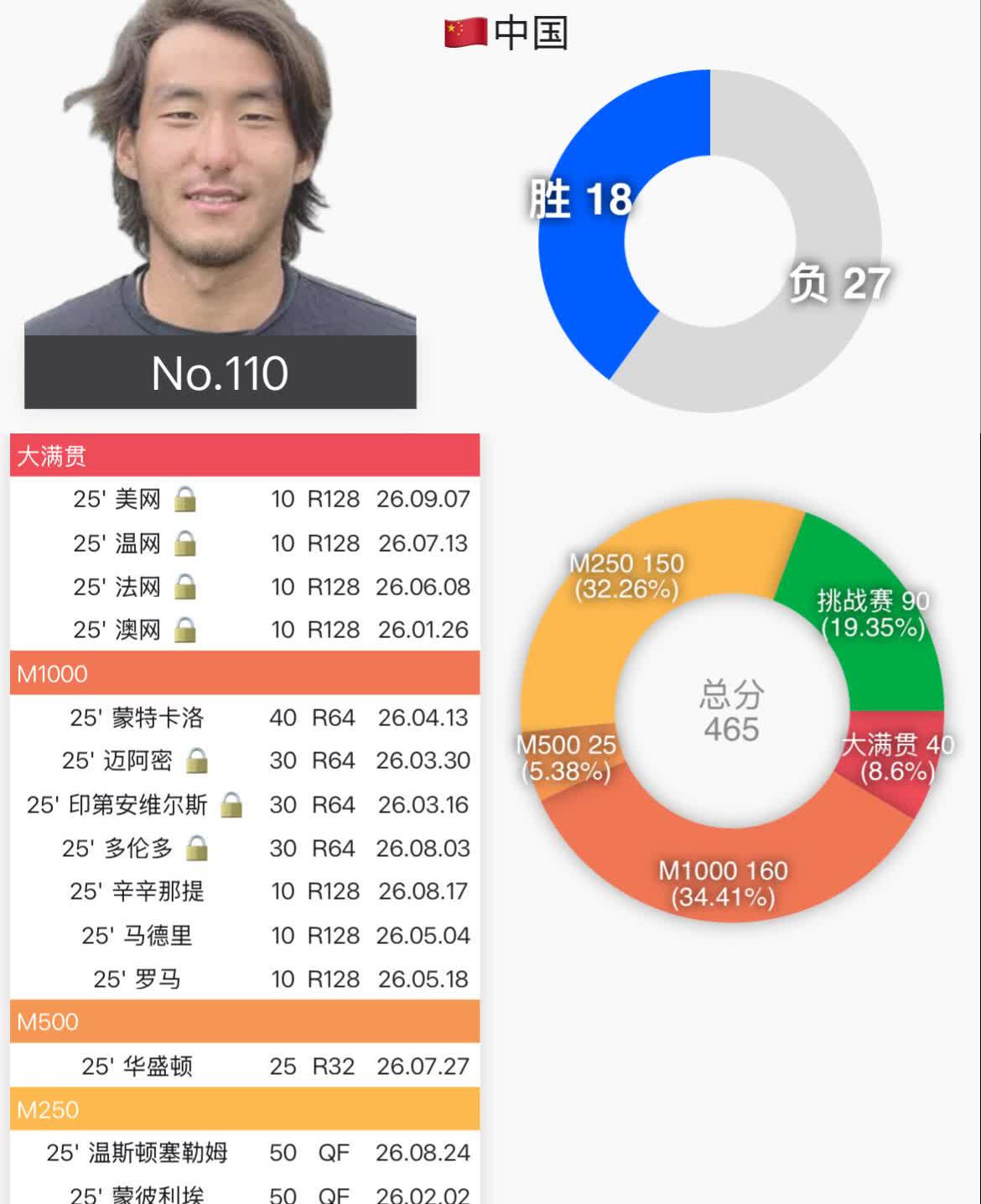 布云朝克特保分压力巨大。 昨晚布云朝克特输给张之臻后,杭州站颗粒无收,去年的四强100个积分没了,世界即时排名回落到86位,即时积分为721分。 接下来小布持外卡参加中网ATP500赛。 去年的中网小布大放异彩。 首轮6-7(3)/6-2/6-4商竣程,次轮6-2/6-4淘汰赛会18号种子穆塞蒂,1/4决赛又7-5/6-4战胜赛会6号种子卢布列夫,半决赛3-6/6-7(3)负于辛纳,三连胜给小布带来了200个“巨分”,赛后排名直升至69位。 这一年来凭借着这“100➕200”个积分的保驾护航,小布的世界排名一直稳定在64~76之间。 本赛季小布12胜25负,ATP250温斯顿塞勒姆男单三连胜是其高光时刻,收获了50个积分。小步的冠军积分只有465分,排名110位。 去年中网的200个积分马上又要被扣了,排名将继续下滑,明年澳网的正赛有悬念了。 加油啊!布云朝克特。