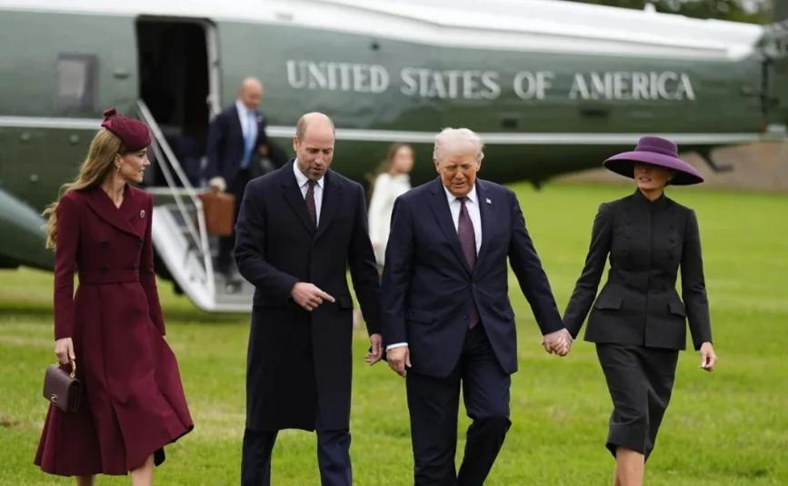 特朗普访英,梅拉尼娅和凯特王妃罕见时尚对决,一个穿成1米8落地灯,一个疑戴假发。 最近,美国总统特朗普和他夫人梅拉尼娅再次访问了英国。 这是他第二次对英国进行最高规格的国事访问,待遇超过了以往的美国总统。 在这样的访问中,除了国家大事,两位夫人的穿着打扮也总是人们关注的焦点。 梅拉尼娅的穿衣风格一向大胆,这次也不例外。她抵达伦敦时是晚上,穿了一件长款风衣和一双平底长靴,显得很干练。 特朗普则穿着黑色长大衣,一下飞机就牵着夫人的手,比过去显得亲密许多。不过,很多人觉得,梅拉尼娅愿意被牵着,可能不只是为了展现恩爱,更是出于对丈夫身体状况的担心。 近来,关于特朗普健康不佳的传闻很多。有报道说他衰老得很快,精神状态大不如前。比如,他在和别国领导人开会时被拍到打瞌睡,观看体育比赛时也睡得很沉。 还有照片显示他手上有大片紫色痕迹,外界猜测是频繁打针所致,甚至需要用化妆品来遮盖。考虑到这些情况,梅拉尼娅扶着他,或许是为了确保他的安全,防止他走路不稳或出现意外。 访问第二天,他们乘直升机抵达温莎城堡,由威廉王子和凯特王妃迎接。两位女士都穿着高跟鞋走在草地和石子路上,看起来颇为不易。 凯特王妃的打扮比较传统,一身红色,显得端庄得体。她穿了一件她穿过多次的英国品牌大衣,并佩戴了精致的首饰。 相比之下,梅拉尼娅的造型就夸张许多。她穿了一条深灰色裙子,头上的紫色帽子与裙子颜色并不协调,但却和特朗普的紫色领带形成了呼应。 这顶帽子非常大,造型很特别,有人说像个大茶杯盖。因为帽子几乎遮住了她的半张脸,大家开玩笑说,她戴这么大的帽子可能是为了不方便让丈夫亲她。 在欢迎仪式上,这顶大帽子确实带来了不便,让她看路和看人都不太方便。在与合唱团的孩子们见面时,有个小女孩甚至被她这身“看不见脸”的打扮吓到了。 她似乎需要靠触摸丈夫的手来辨别方向。后来参观宫廷藏品时,她站在那里,因为帽子的缘故,一眼望去很难被发现,有人开玩笑说以为那里立着一盏落地灯。 特朗普夫妇的一些行为也引起了英国民众的议论。他们乘坐的直升机比预定时间晚到了二十多分钟,让威廉和凯特在风中多等了许久。 这并非特朗普首次在礼仪上失当。他以前访问英国会见女王时,也曾让女王等他。在检阅仪仗队时,他自顾自地走在前面和卫兵聊天,把查尔斯国王甩在了后面,显得不够尊重主人。 为了这次国事访问,英国王室做了非常充分的准备。他们在温莎城堡举办了盛大国宴,筹备工作耗时半年。宴会厅的长桌布置花了一周时间,每套餐具的摆放都经过精确测量。 菜单也很讲究,食材均来自王室花园。参加宴会的嘉宾都是各行各业的重要人物。 晚宴上,两位夫人的穿着再次成为焦点。梅拉尼娅穿了一条亮黄色拖地长裙,露着肩膀,气色看起来非常好,显得雍容华贵。 凯特王妃则穿了一身金色礼服,上面有手工刺绣的金线,非常华丽。她还戴上了王室珍藏的王冠和耳环,尽显王室风范。特朗普在宴会上还特意称赞凯特“光彩照人、健康美丽”。 为了在这次重要活动中展现最佳状态,凯特王妃付出了很多努力。她不仅换了全套衣服首饰,连发型和发色都在一天内换了两次。 早上迎接客人时,她是一头浓密的棕色波浪长发;到了晚宴,头发就变成了带有金色挑染的细小波浪卷。 此前,凯特的发色在半个月内变了三次,引发了外界关于她是否戴假发来掩盖身体问题的猜测。 为了回应流言,她还在一次活动中当场盘起长发,以证明头发是真的。作为王室的重要成员,她总是要面对各种关注和议论,确实很辛苦。 除了正式活动,凯特还单独邀请梅拉尼娅参加了一个与孩子们有关的户外活动。两人都穿着比较休闲的服装,站在一起时,凯特显得更高一些。 在活动中,她们和孩子们一起玩耍、画画,气氛很轻松。梅拉尼娅在离开丈夫的场合里,露出了难得的笑容,看起来非常开心。