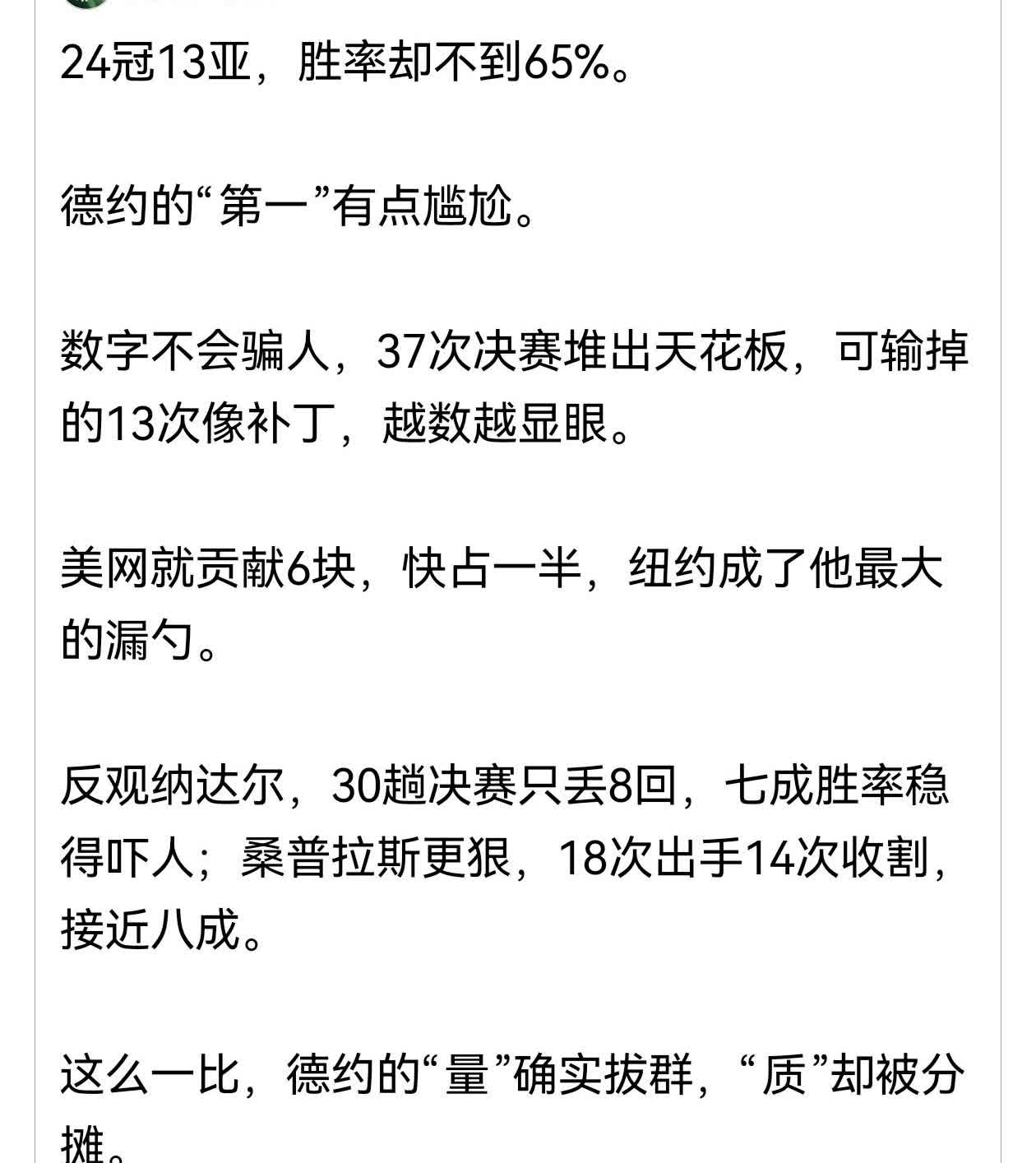 都说数字不会骗人,所以,你这数字也骗不了人。 1.德约科维奇37次打进决赛,纳达尔才30次。如果再给纳达尔7次机会,是不是会多7个亚军呢?[大笑] 2.德约科维奇24冠13亚,纳达尔22冠8亚……无论是比冠军数,还是硬生生给德约减去2冠,假设冠军数与纳达尔同为22冠,再比较亚军数,那也还是德约科维奇遥遥领先。 以上两个数据,哪一项不比决赛胜率更重要呢? 戈麦斯的大满贯决赛胜率为100%,只一次晋级决赛并夺冠。按你的逻辑,他应该站在三巨头的肩膀上了。。而且,不止是仅有戈麦斯。 如果想给纳达尔刷粉,只有一条:他是绝对的红土之王。你可以在红土数据举例。