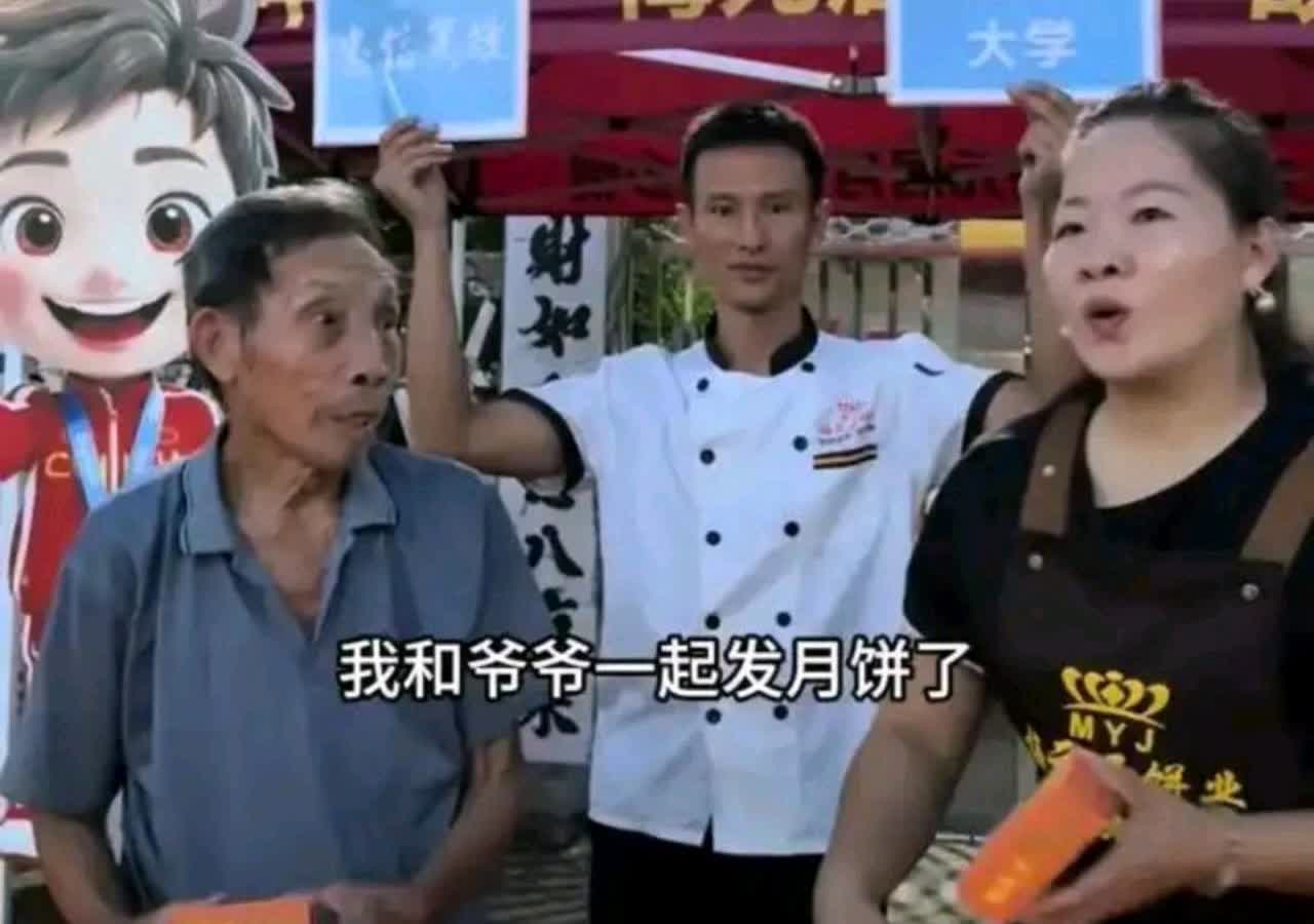 中秋节快到了,商家为了赚钱,拉着全红婵爸爸,爷爷他们一家人在自己家门口发月饼