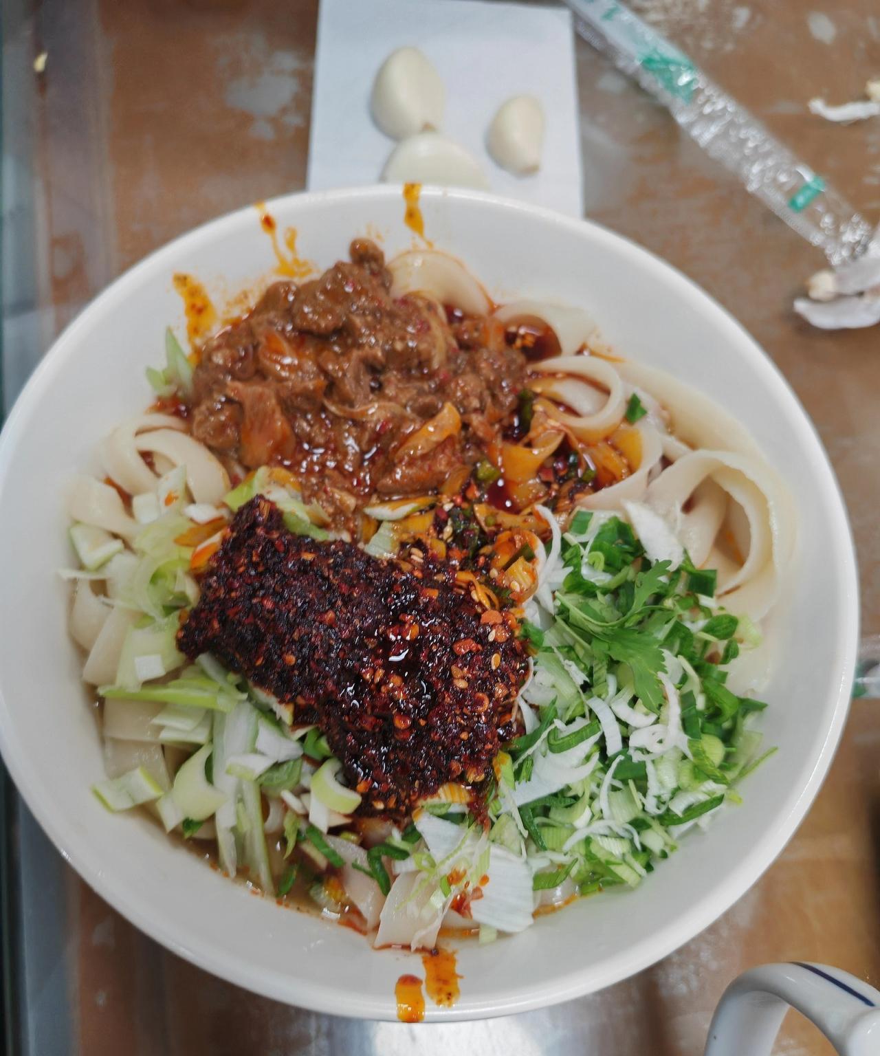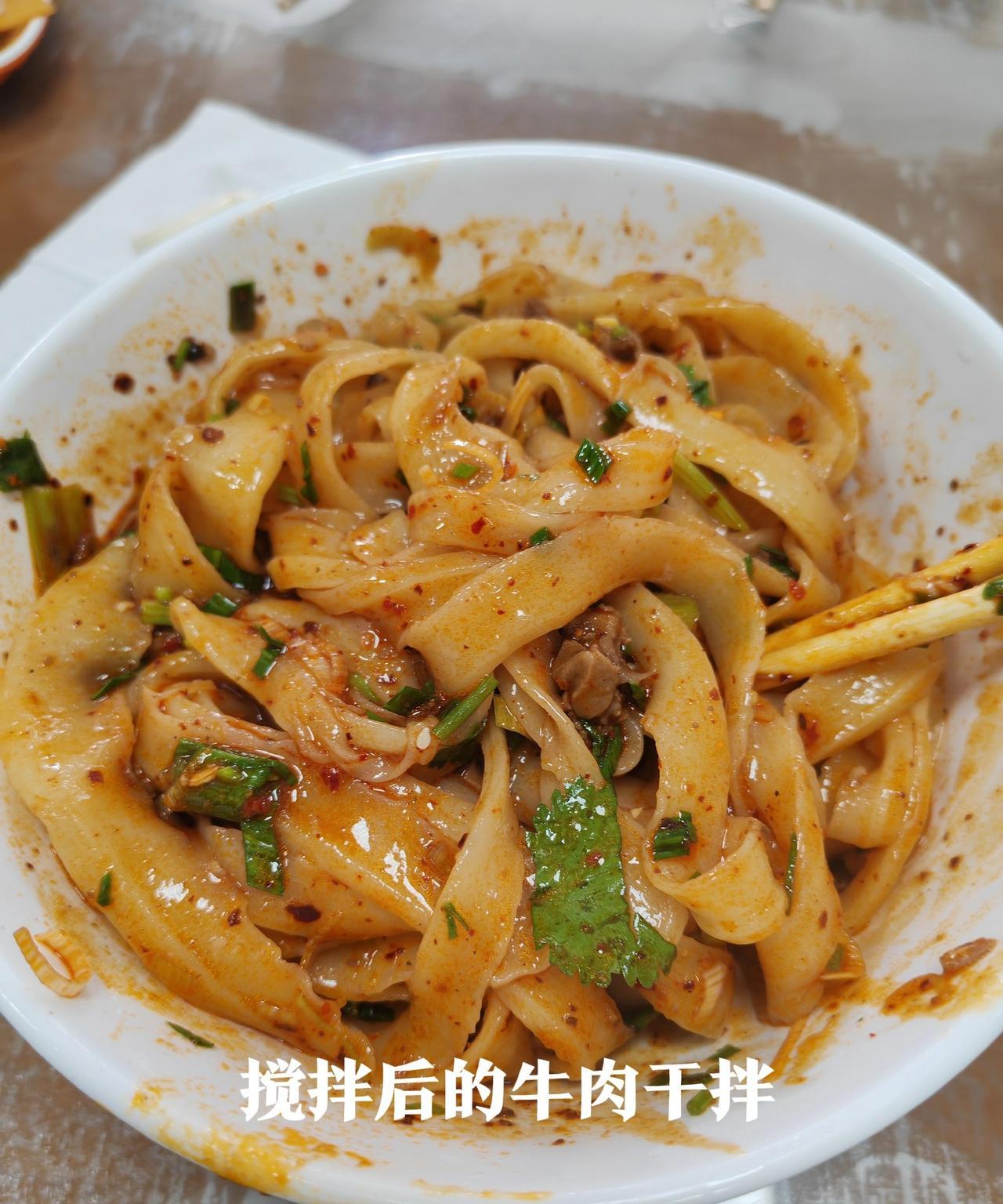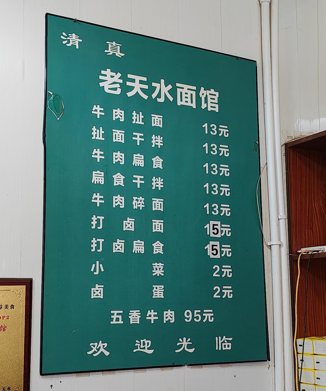 在天水生活了多半辈子,经常吃面条,今天算是第一次见这么专业的地方特色面馆。 今天上午从甘肃陇南武都区乡下农村亲戚家吃了早饭,侄娃就开始驾车拉我们5个人沿高速往回返。到天水下高速已经是下午两点多了,我建议吃一碗面了再各自回家。 侄娃说市上有个老天水面馆,非常好吃,中午到饭点要排队等候。我说这个饭馆在哪里?去尝尝。我们一路从皂角镇十天高速天水南收费站下高速,经暖和湾再过赢池大桥沿籍河北路一直向东到市政公司附近,才到达这家饭馆。 这是一家专门做天水地方特色的清真面馆,店面不是很大,但里面干净卫生,面条都是手工扯面。 他们家的扯面不是薄而宽的那种,而是窄而厚,吃起来非常劲道。做好的扯面只是在臊子上有区别,有牛肉臊子和打卤两种。分干拌和汤面,一碗都是13块钱,扯的面条煮熟捞到碗里,然后浇上臊子或打卤汤汁,再撒上葱花香菜,放上油泼辣子,自己调上香醋,吃起来非常香。店里还有自己卤的牛肉,一斤95元,客人可以根据需要秤斤,店里切片凉拌后再食用。 听侄娃说,他们单位几个人在市上办事,去这里吃过一次,正好是中午饭点,排了好一阵子队才吃上。 我感觉这家面馆之所以生意好,有几点原因。一是面馆专而精。他们家只做手工扯面,没有其它的品种。不像大多数饭馆一样,品种繁杂,多而全,啥也有,啥也不精不正宗。二是手工扯的面条有特色,是一种像刀削面一样的三棱子面条,不是大多数扯面馆里薄而宽的裤带面或拉条子,这种面条是怎么扯出来的,我还想象不到;三是牛肉臊子有特色,牛肉酱香浓郁,牛肉臊子肉粒大而多,可以说是正儿八经的有牛肉的牛肉面。四是碗大面量不少,味道口感独特。到这里吃饭的基本都是像侄娃这样吃过的回头客,吃过一次的人感觉好,一传十,十传百,口碑和名气自然而然就有了。 大家说说是不是怎么样?你看了图片,是不是也很想吃啊?#店面馆# #天水牛肉面# #天水风味面馆# #天水牛筋面#